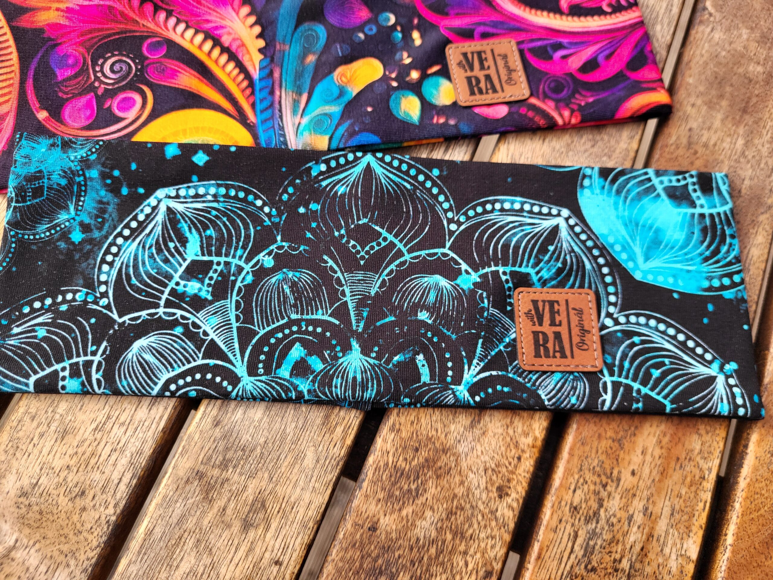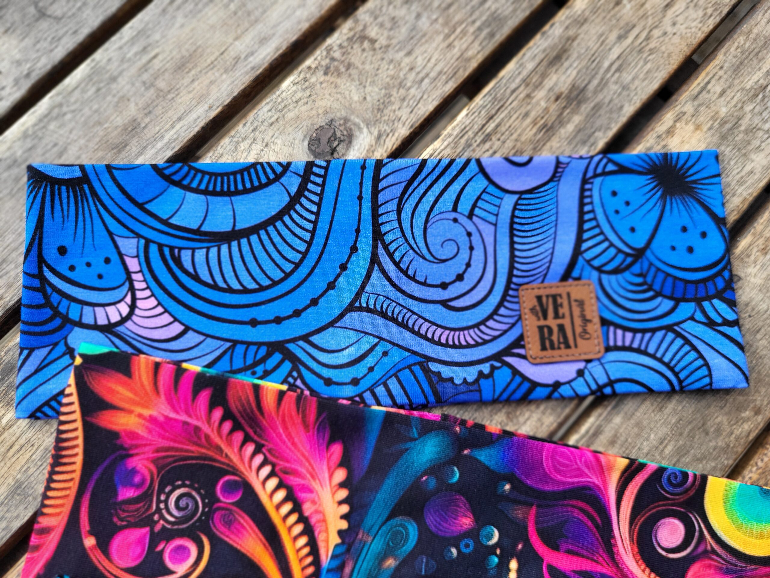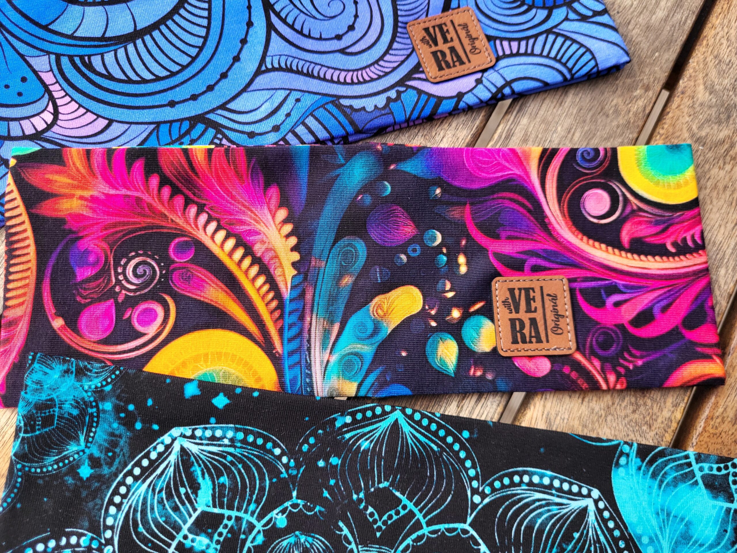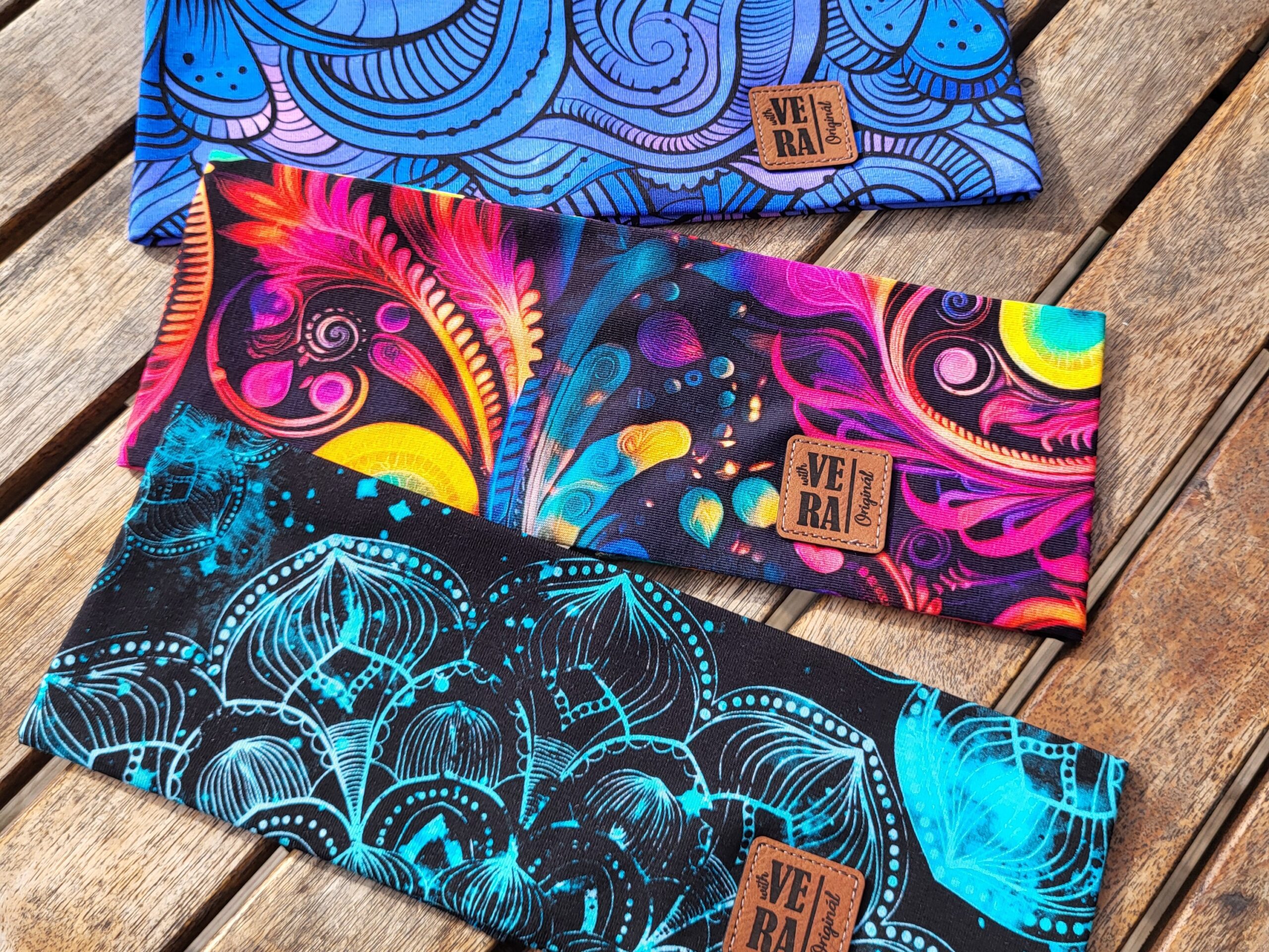 Dámské čelenky z bavlněného úpletu s originálními vzory. Dostatečně široké na zakrytí čela a uší v chladných měsících.