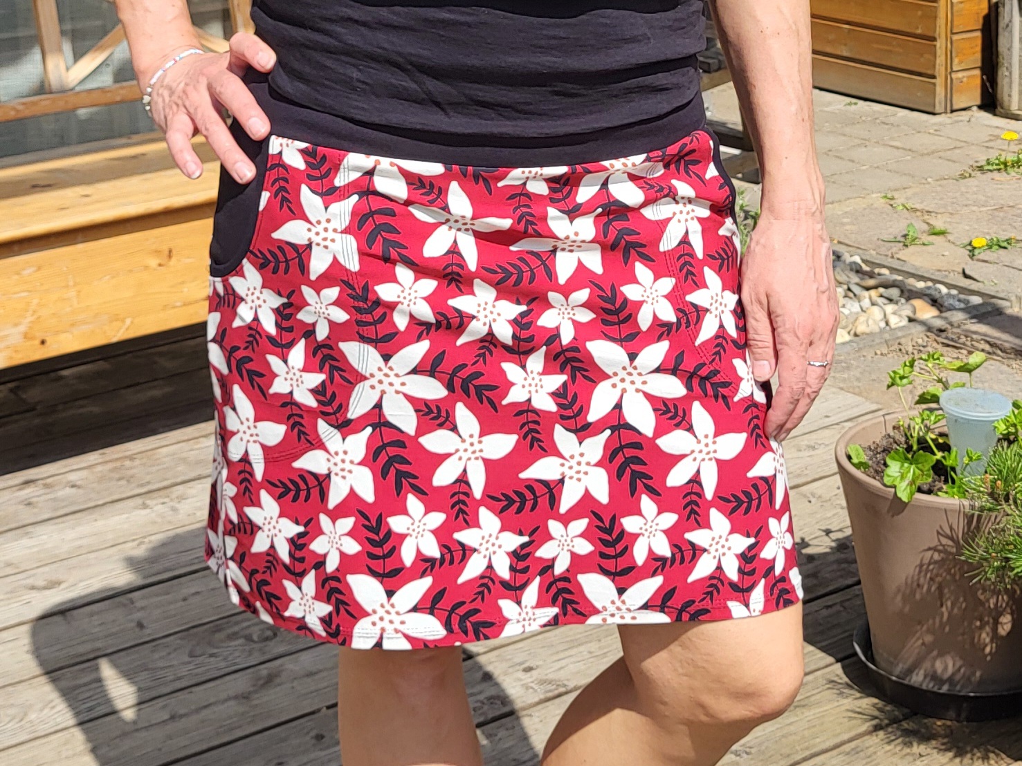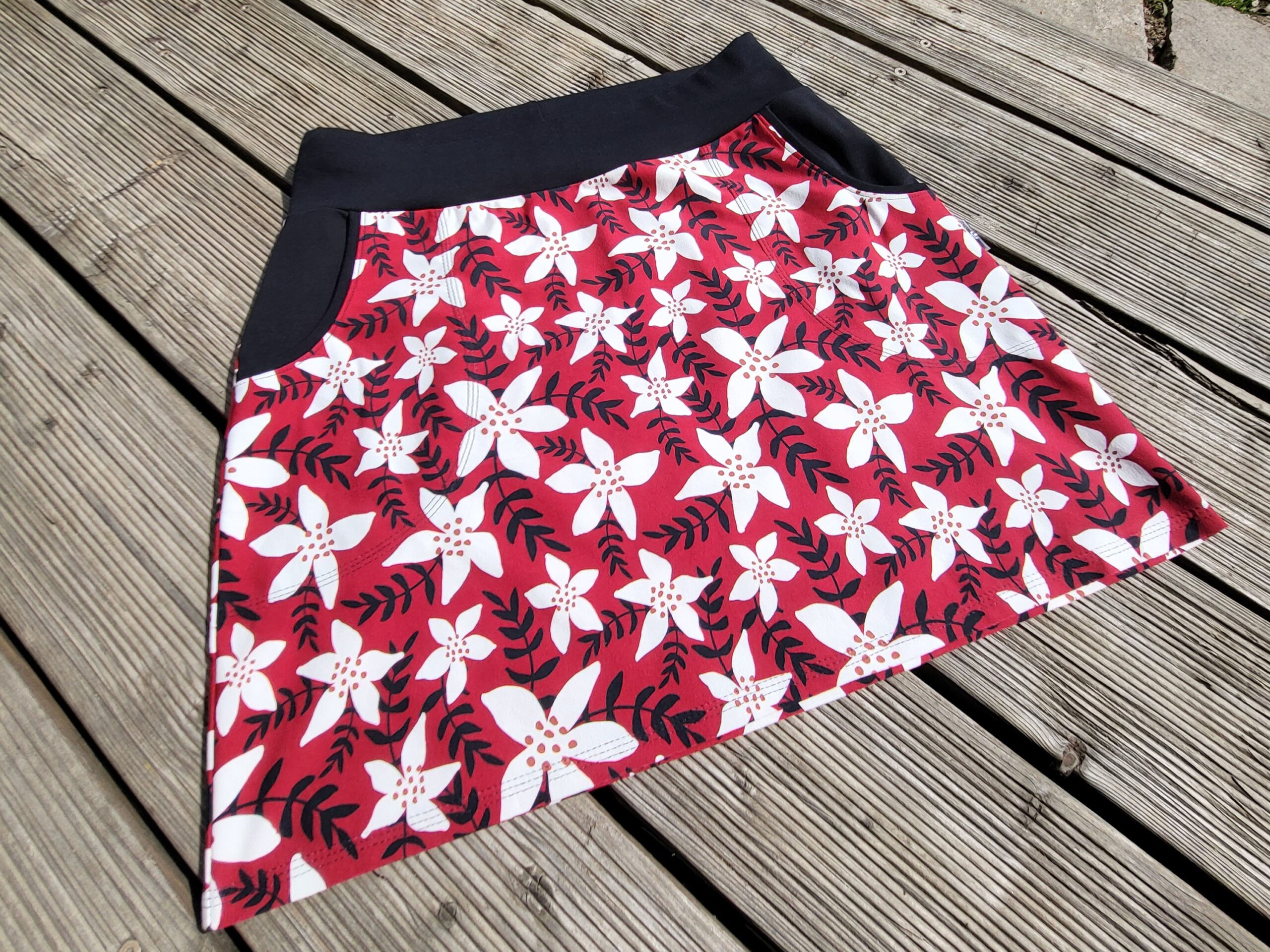 Bílé kvítky na červeném podklady. Jednoduchý vzor na sukně s velkými kapsami. Pas do černého nápletu s gumou, délka nad kolena.