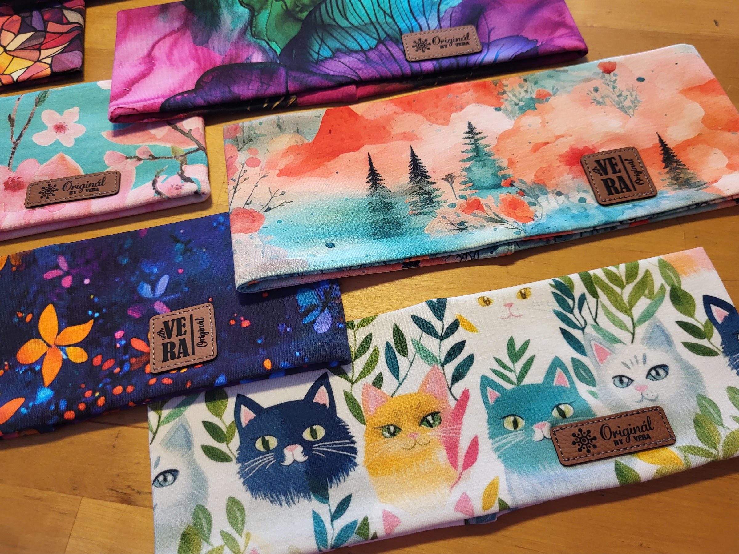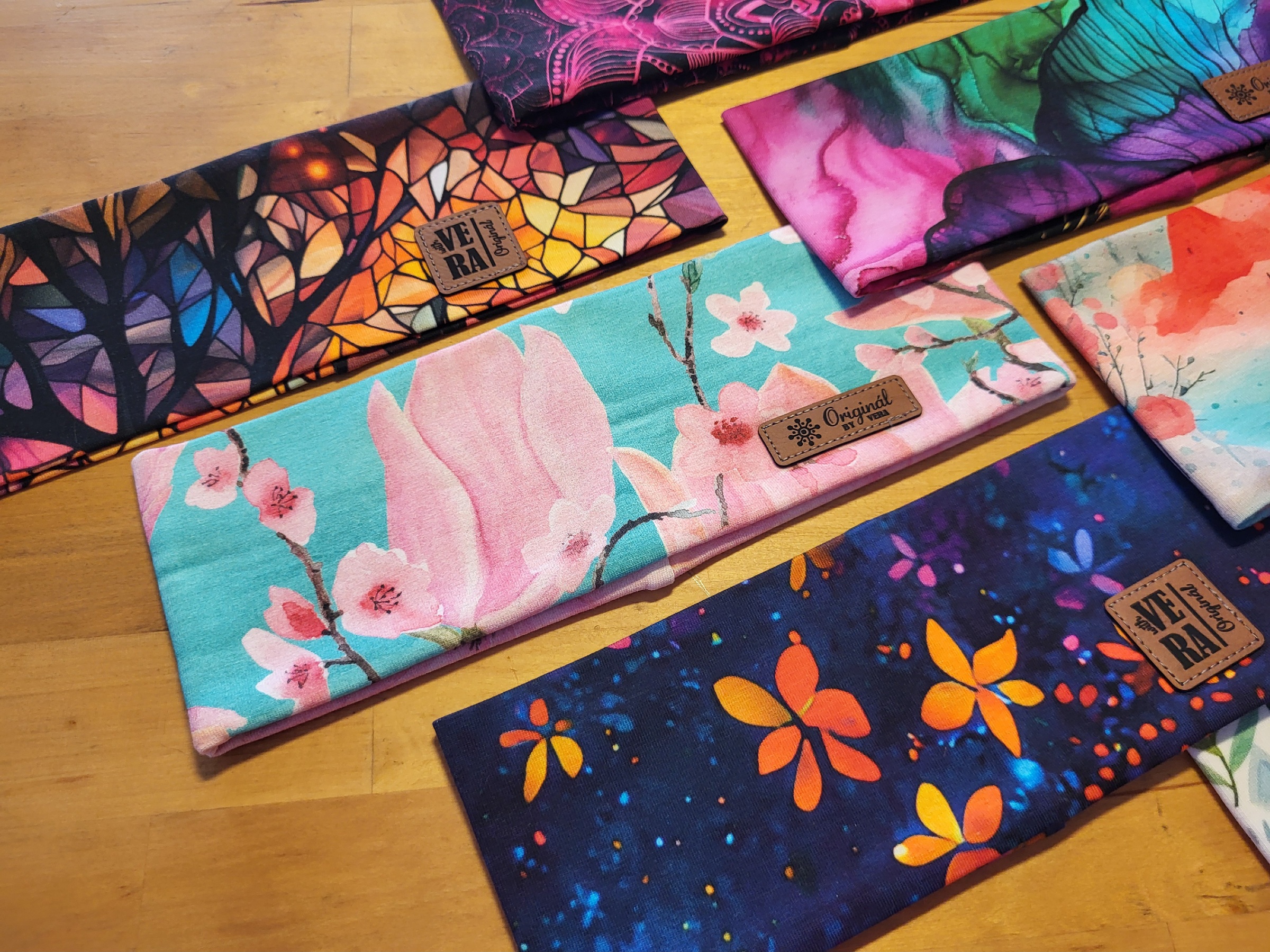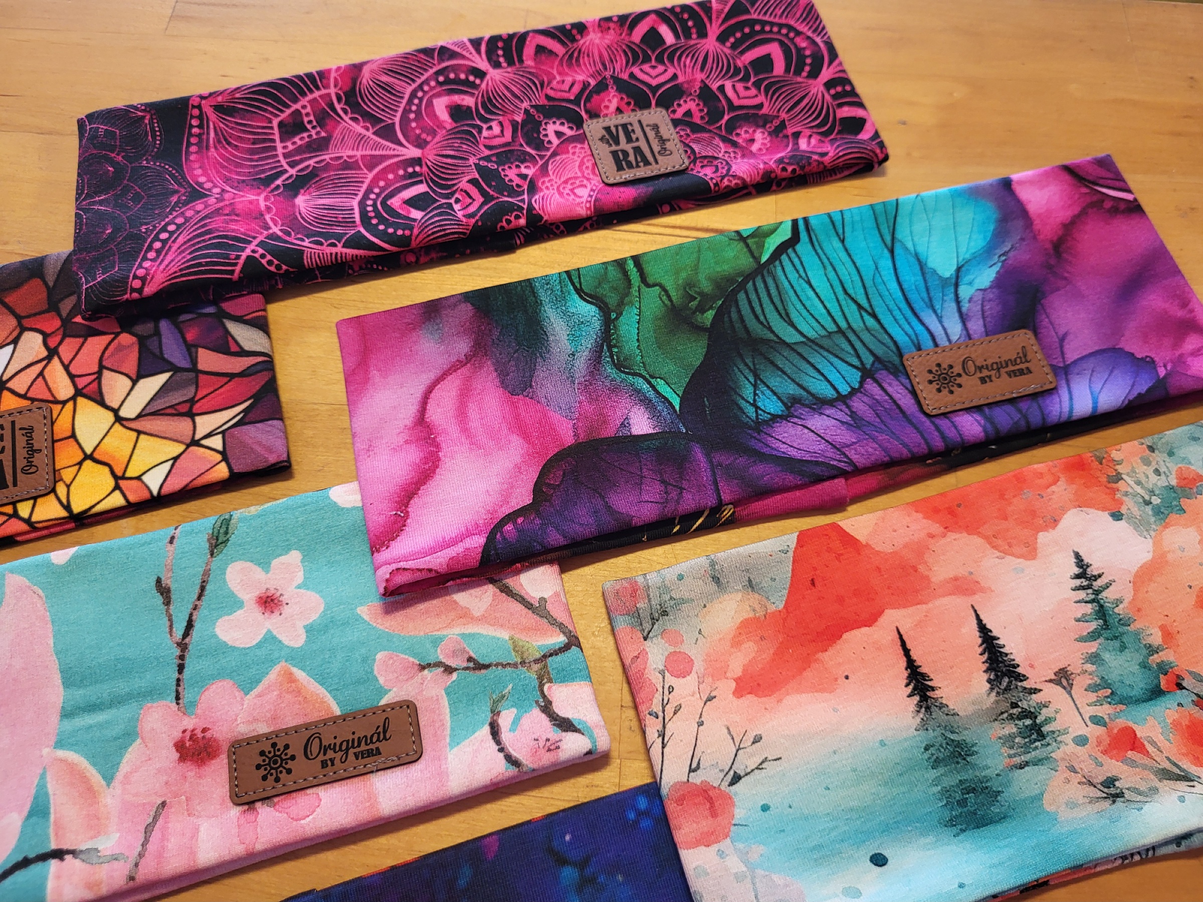 Dámské čelenky z bavlněného úpletu s originálními vzory. Dostatečně široké na zakrytí čela a uší v chladných měsících.