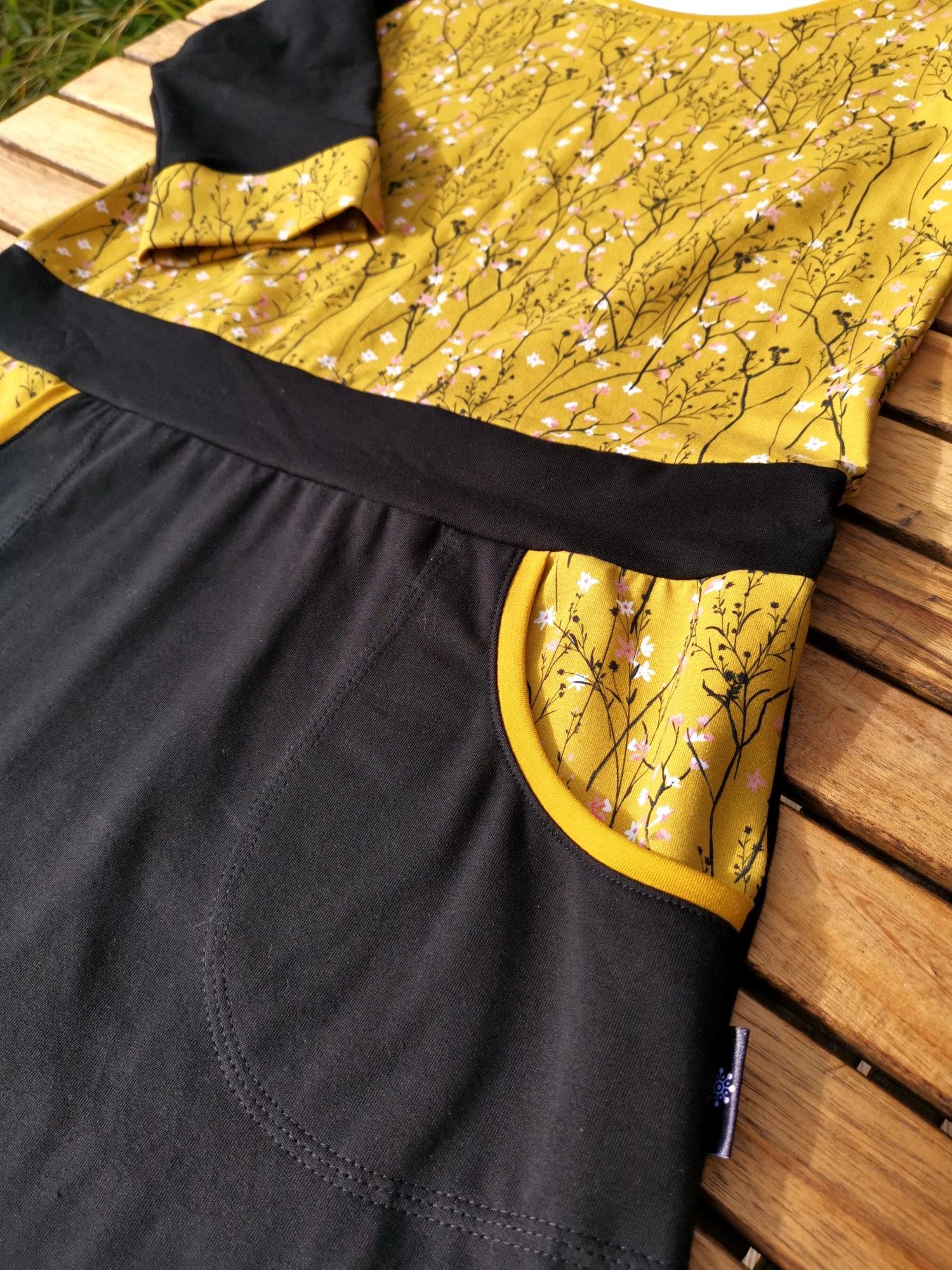 Šaty s oblíbeným motivem sakurových větviček na hořčicové. Zkombinováno s černým úpletem na sukni a 3/4 rukávech. Rukávy mají lemy s rozparkem. Olemované velké kapsy. Délka nad kolena.