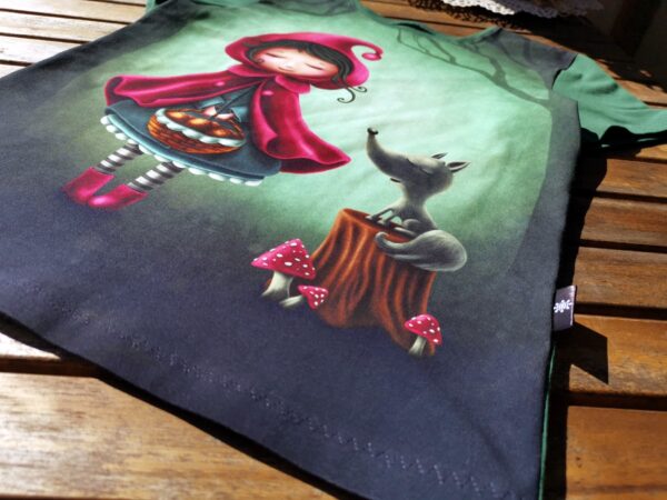 Krásný potisk Malé Karkulky s vlkem na předním díle holčičího trička. Krátké rukávy a zadní díl z tmavě zeleného jemného úpletu.