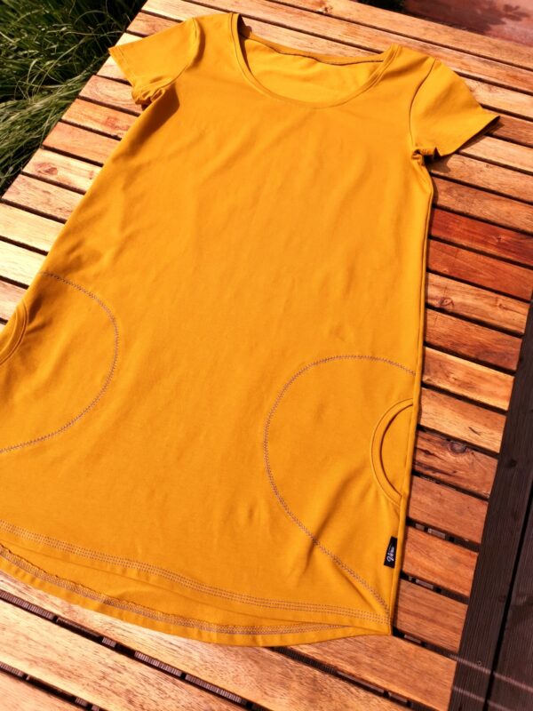 Krátké šaty z hořčicového úpletu. Jednoduchý střih s krátkými rukávy a velkými ozdobně prošitými kapsami. Přední délka nad kolena, zadní délka je prodloužená do oblouku. Skvělé na kombinaci s barevnými leginami.