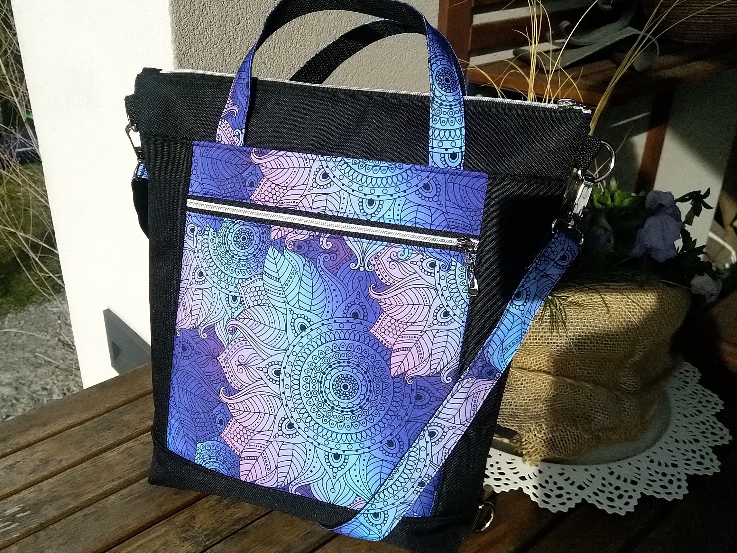 Černo fialová pevná taška na zip s mandalami. Kabela má krátká pošitá ucha do ruky a dlouhý popruh přes rameno. Taška má střední velikost, je vyztužená, má jednu venkovní kapsu na zip a jednu na zip uvnitř ve světle fialkové puntikované podšívce. Délka nastavitelného popruhu 70-130cm. Na zadní straně poutko k rychlému předělání na batoh.