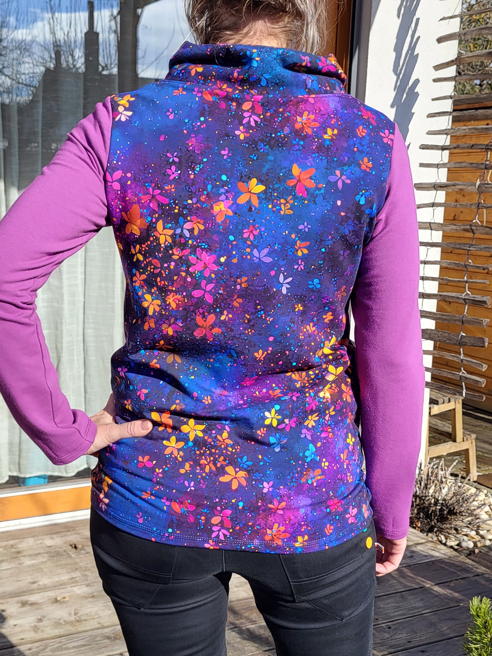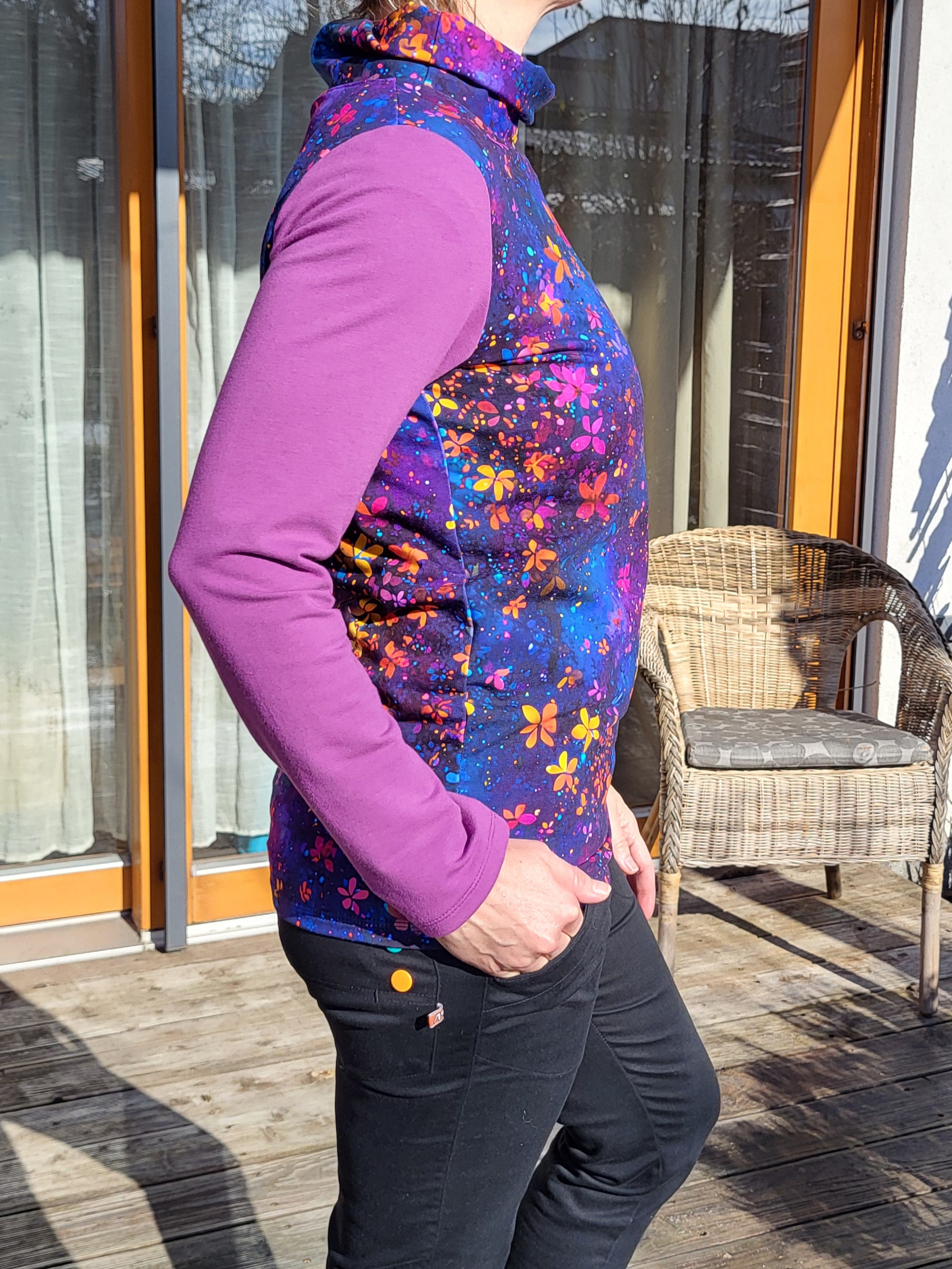 Krásná mikina s jemnými kvítky na tmavě modrém podkladu. S ohrnutým límcem s ozdobnou růžovou šňůrkou. Úžasný barevný vzor kombinovaný s růžovofialovými rukávy.