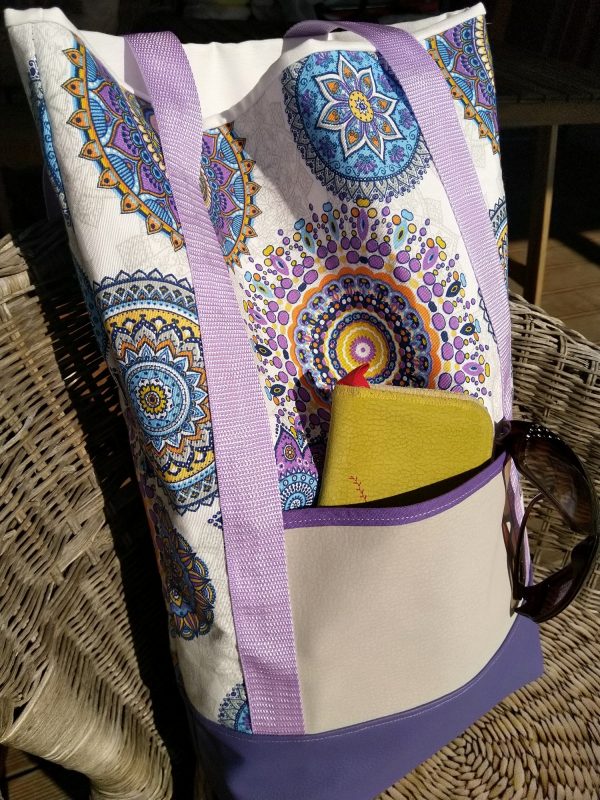 Poměrně velká taška s uchy do ruky či přes rameno. Dno zpevněné fialovou koženkou, předni a vnitřní kapsička na bílé režné podšívce. Krásný mandalový vroz na režné bavlně. Délka uch: 2x 50 cm