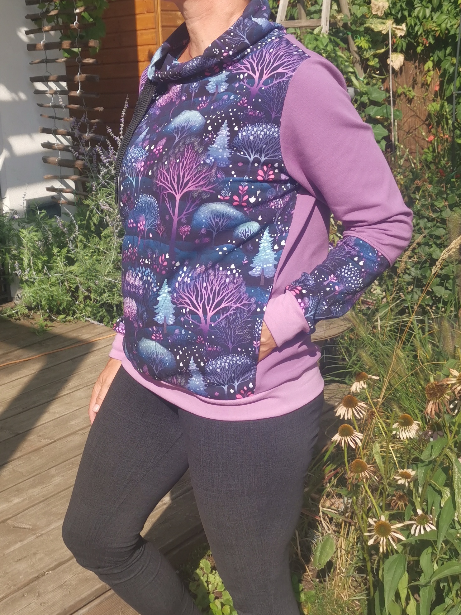 Kratší volná mikina laděná do krásných studných fialovo růžových tónů. Nižší límec, který je možno stáhnout šňůrkami. Skryté boční kapsy.