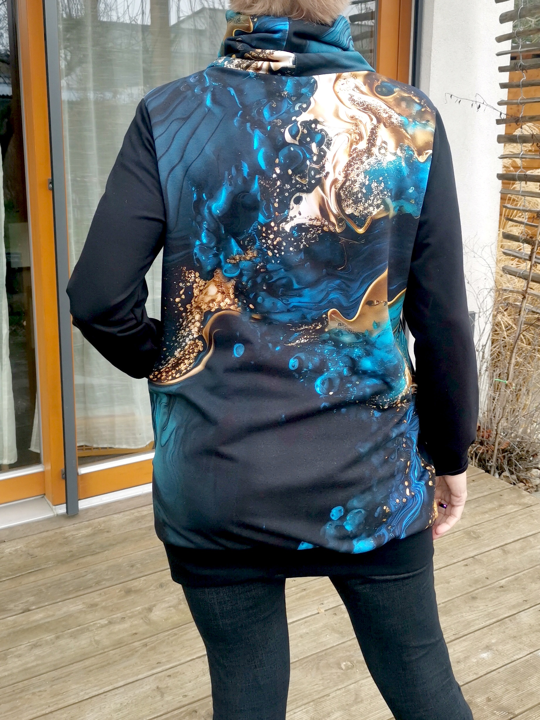 Delší černo modré mikinošaty se zajímavým mramorovým vzorem a vysokým límcem ozdobeným dřevěným knoflíkem. Elegantní vykrojené kapsy. Délka nad kolena.