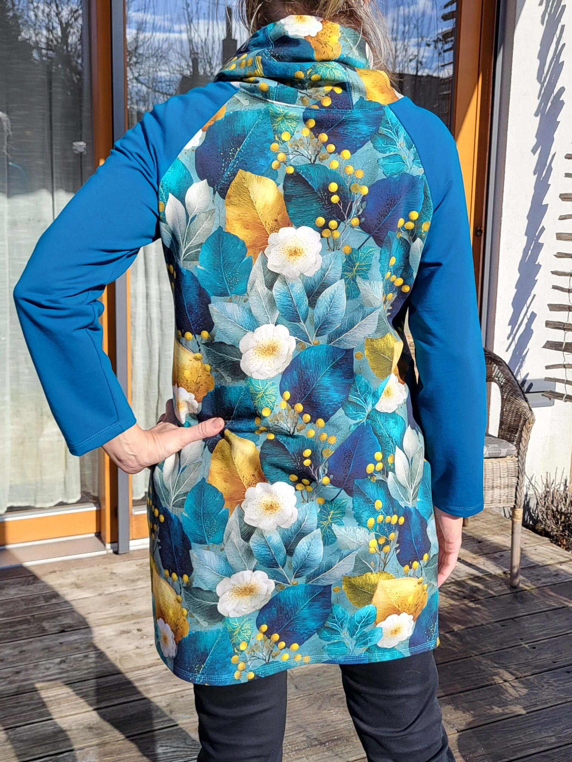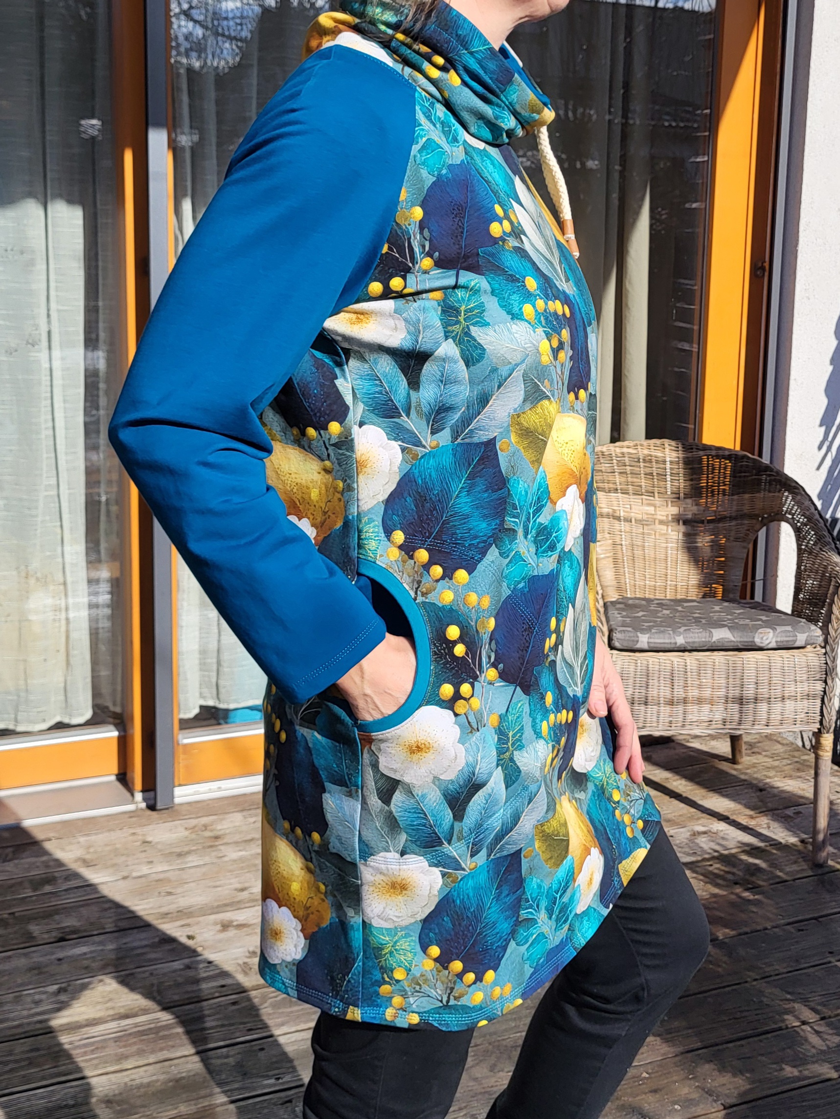 Delší mikinošaty petrolejové barvy s velkými kapsami a vyšším límcem se šňůrkou. Krásným vzor s modrými a zlatými listy.