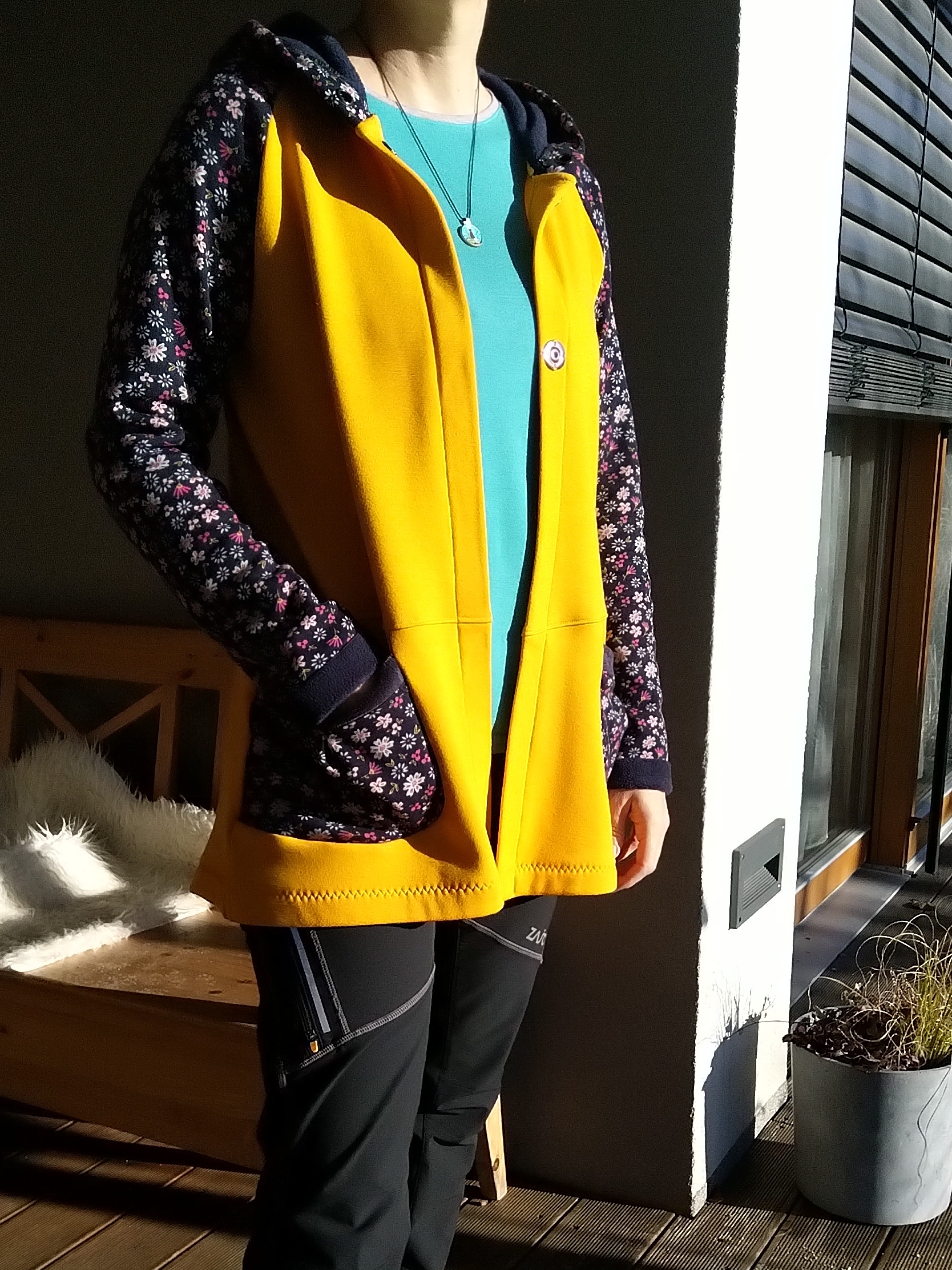Teploučký kabátek raglánového střihu s velkou kapucí a kapsami. Chlupáček z rubu.