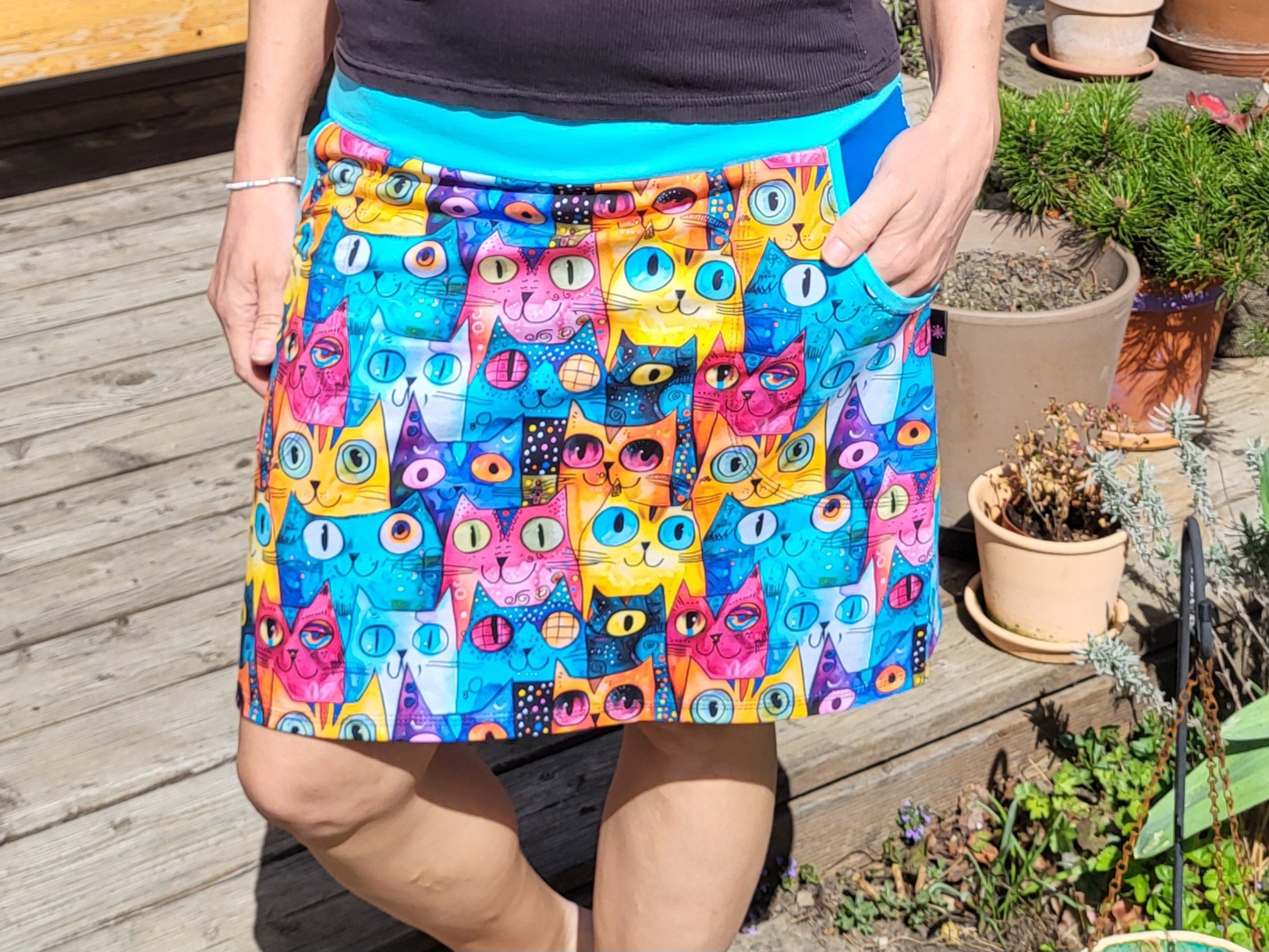 Veselá sukně s barevnými kočkami a velkými modrými kapsami. Pas do světle modrého nápletu s gumou, délka nad kolena.