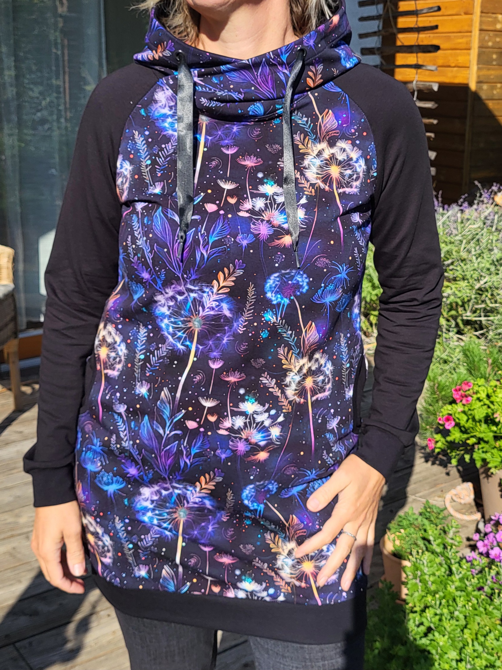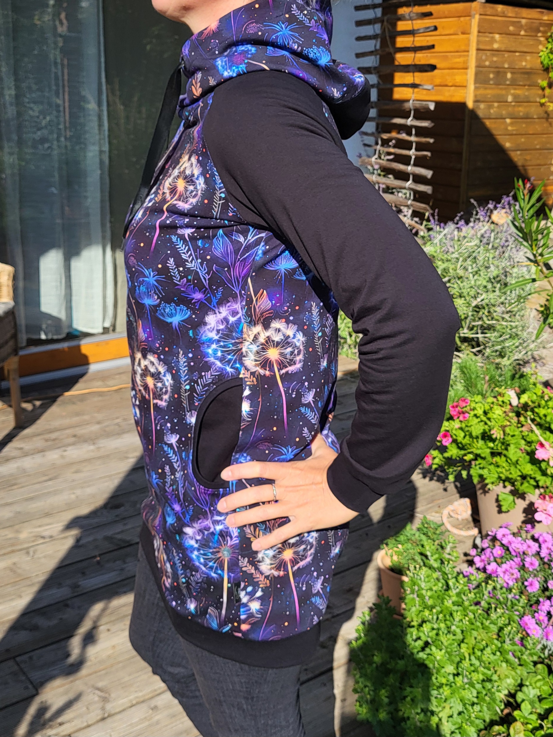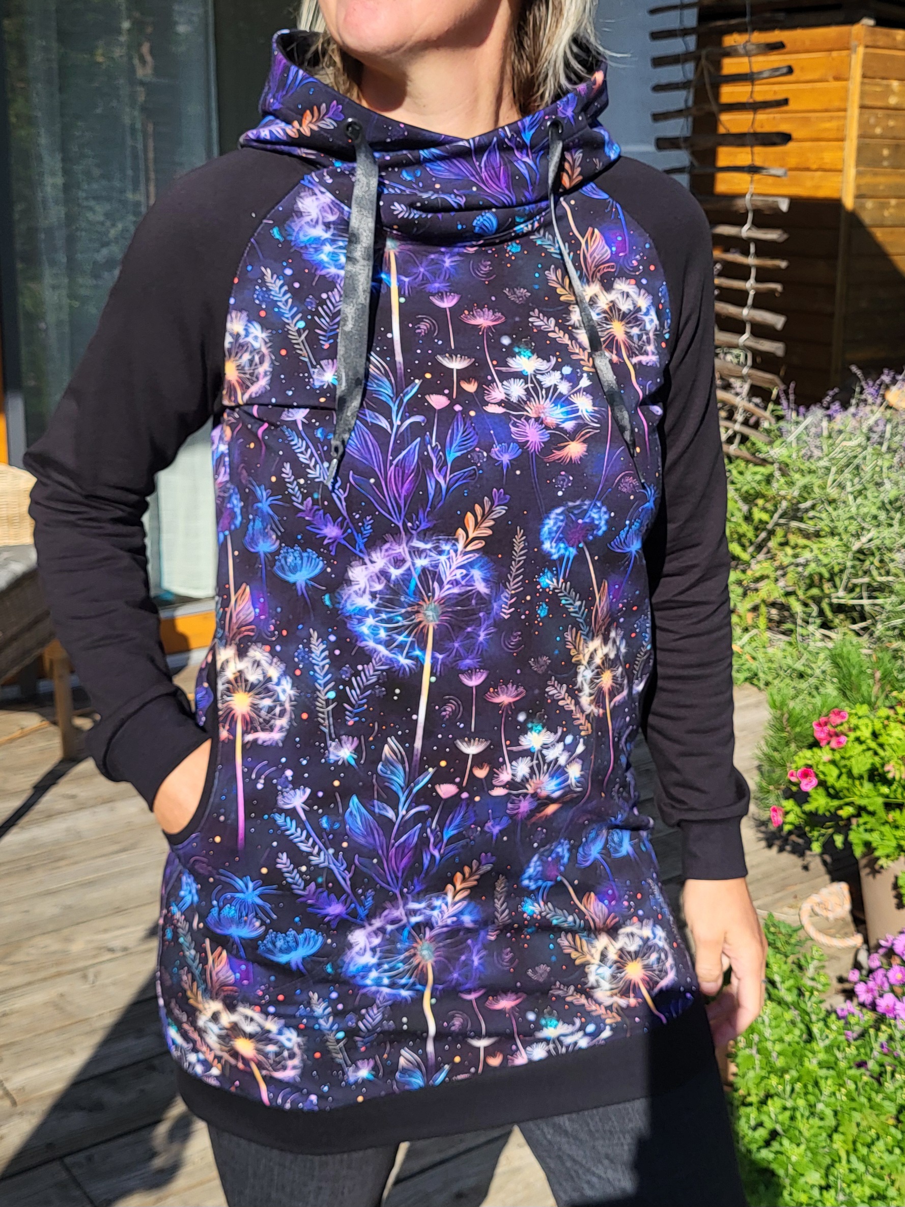 Mikinošaty s kapsami a překříženou kapucí. Temně modro fialový vzor s nočními květy, kombinovaný s černými rukávy.