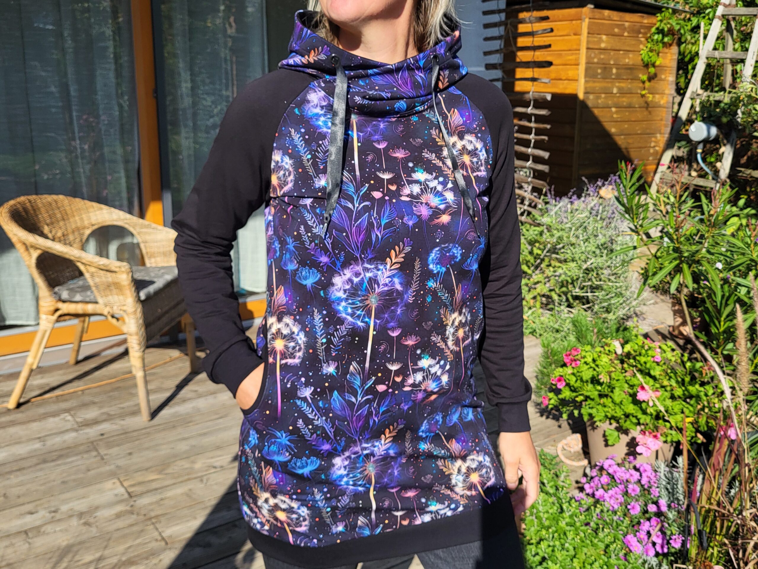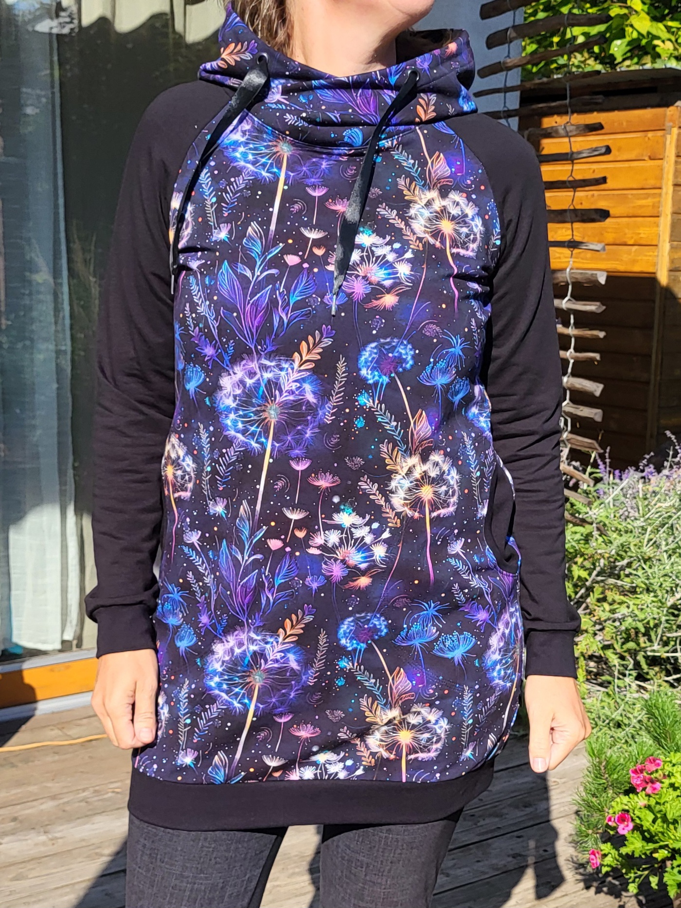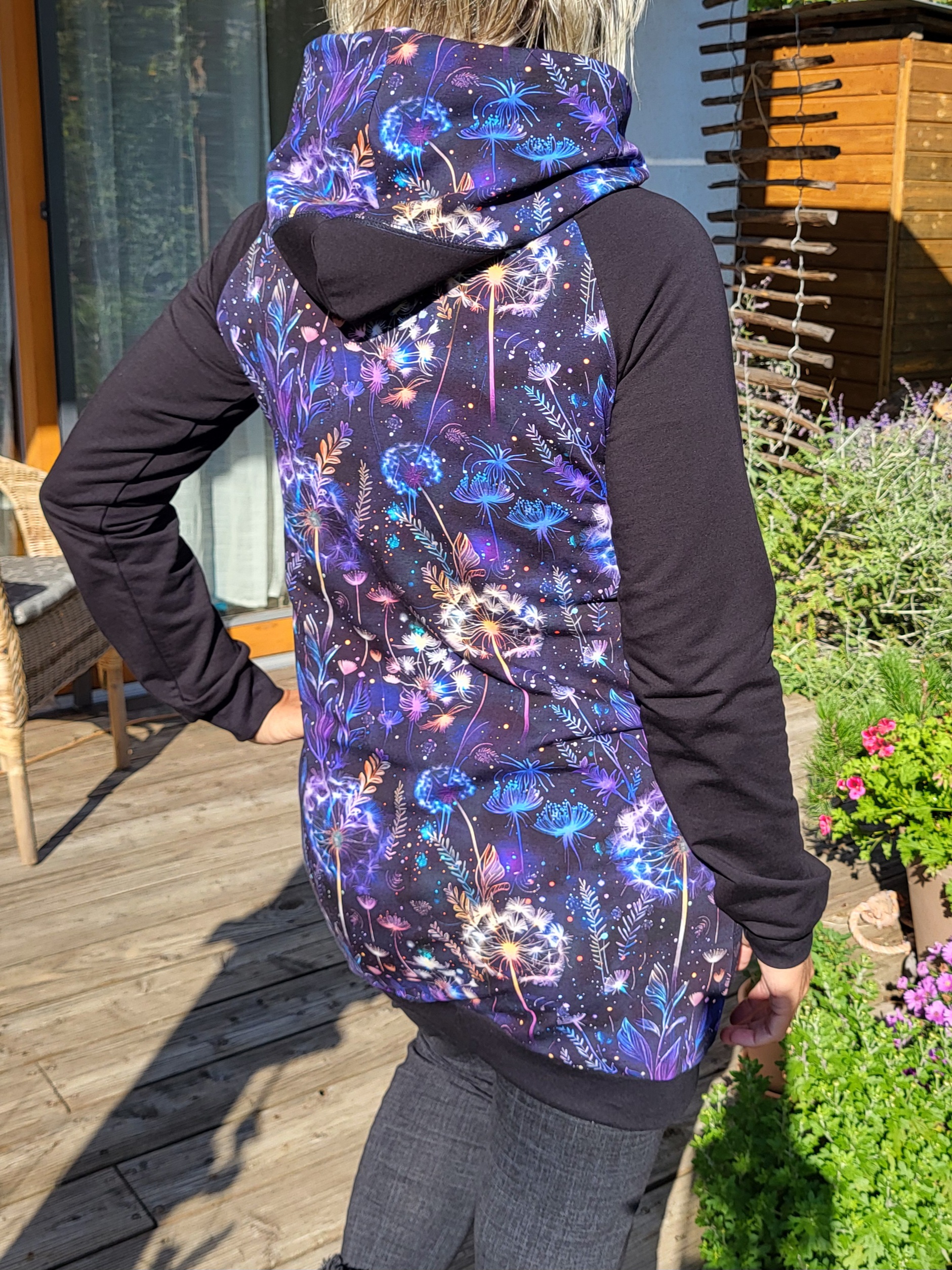 Mikinošaty s kapsami a překříženou kapucí. Temně modro fialový vzor s nočními květy, kombinovaný s černými rukávy.
