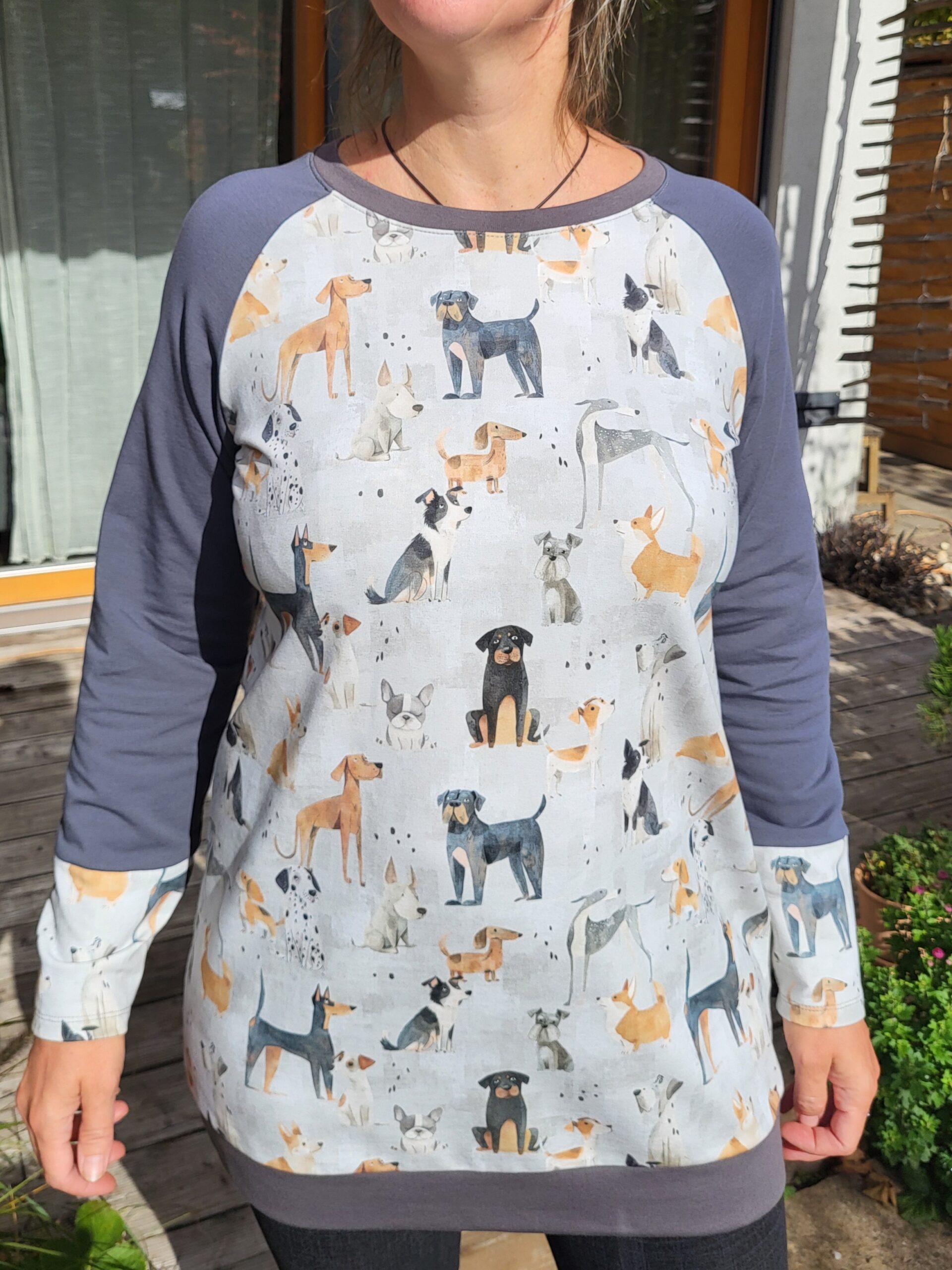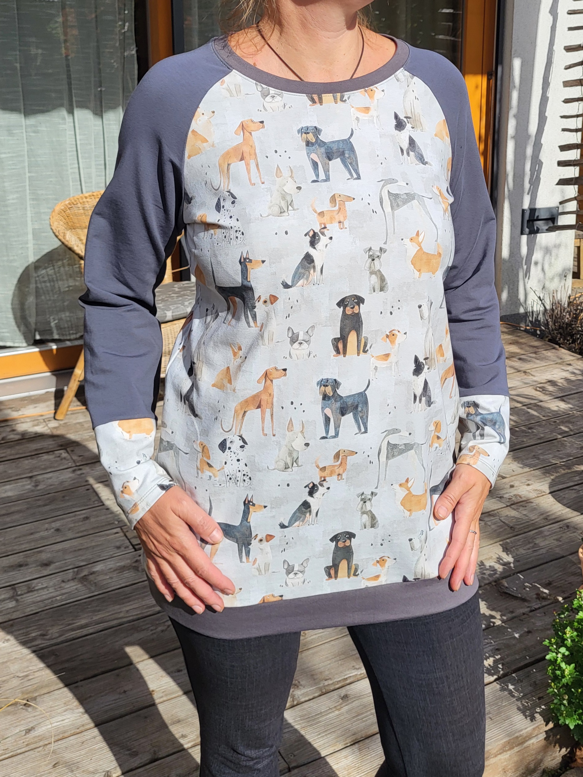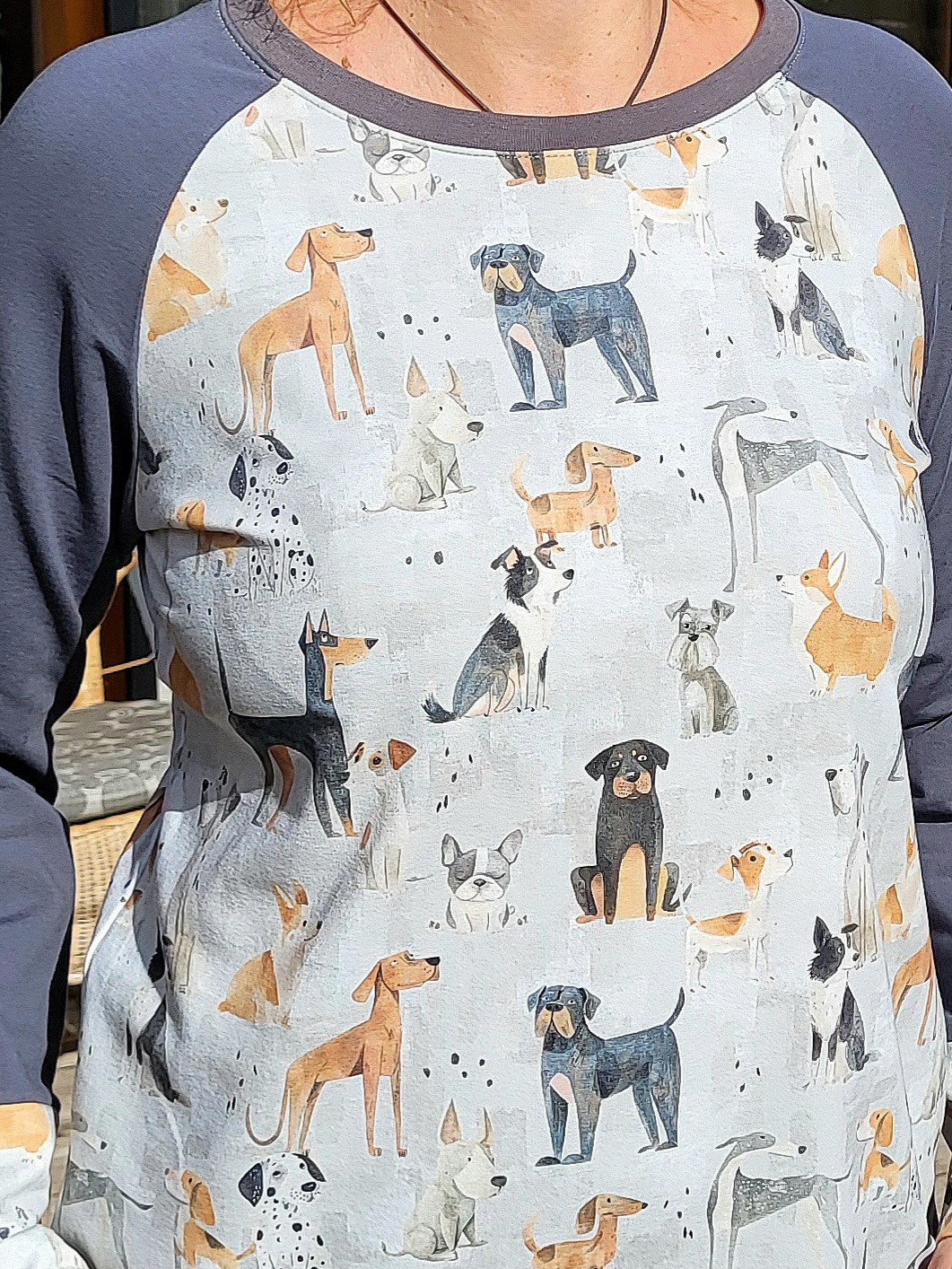 Volná delší mikina s šedými raglánovými rukávy a potiskem pejsků na světle šedém podkladu. Jednoduchý kulatý průkrčník.