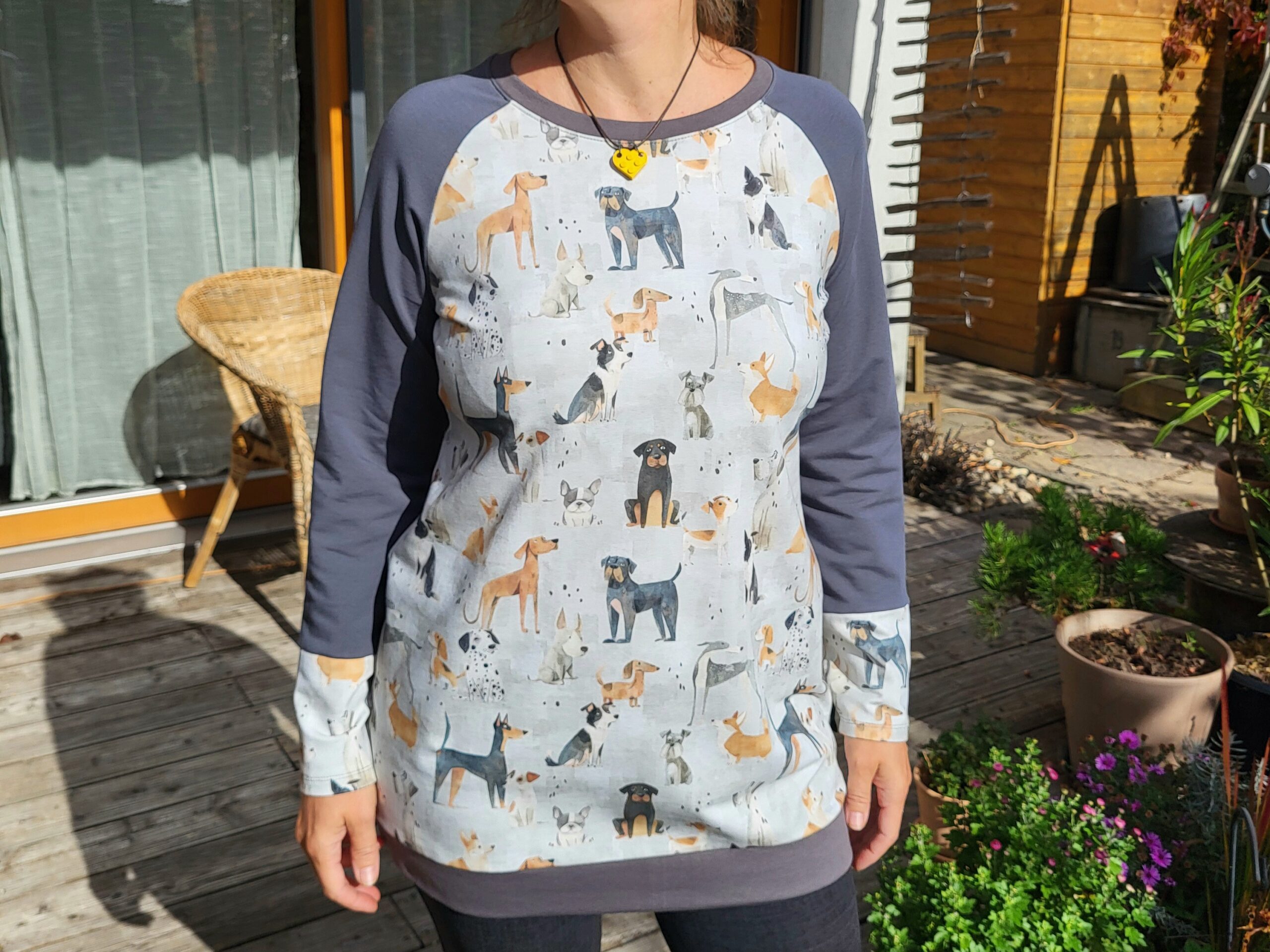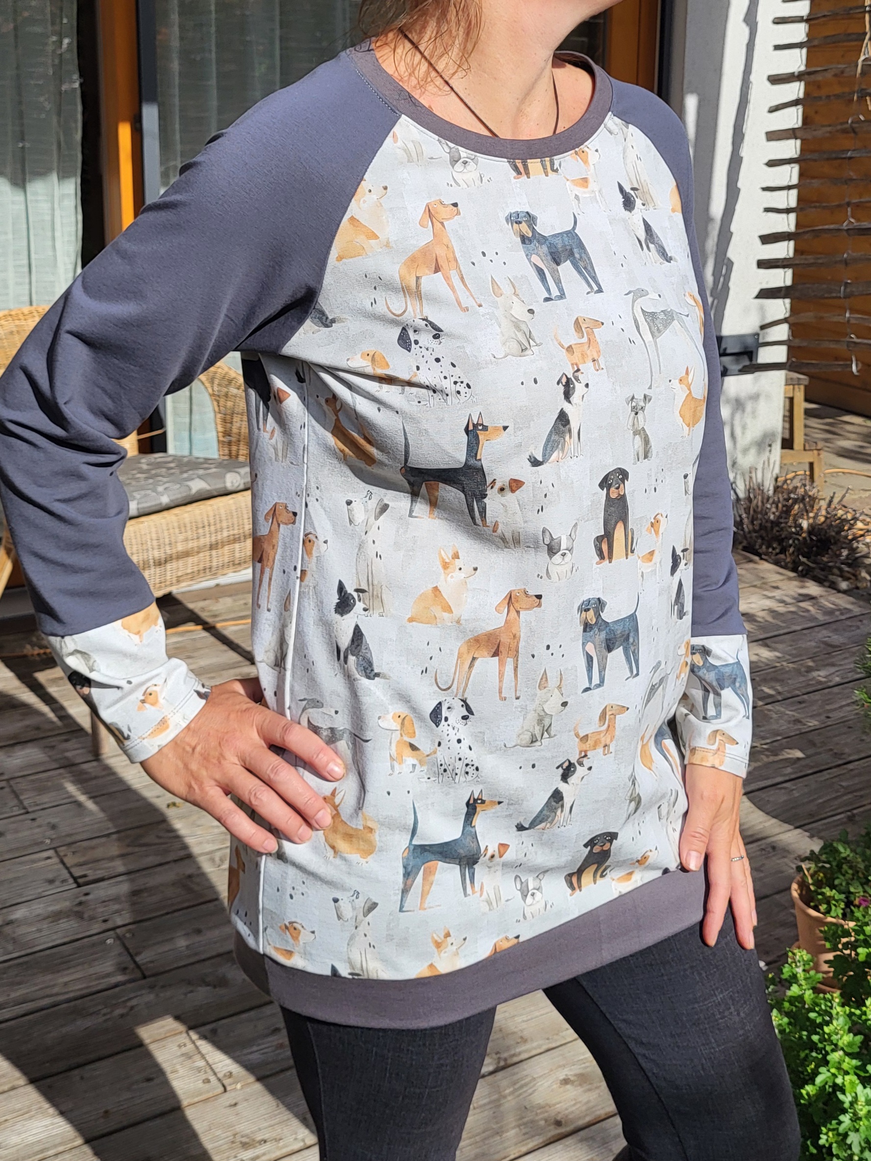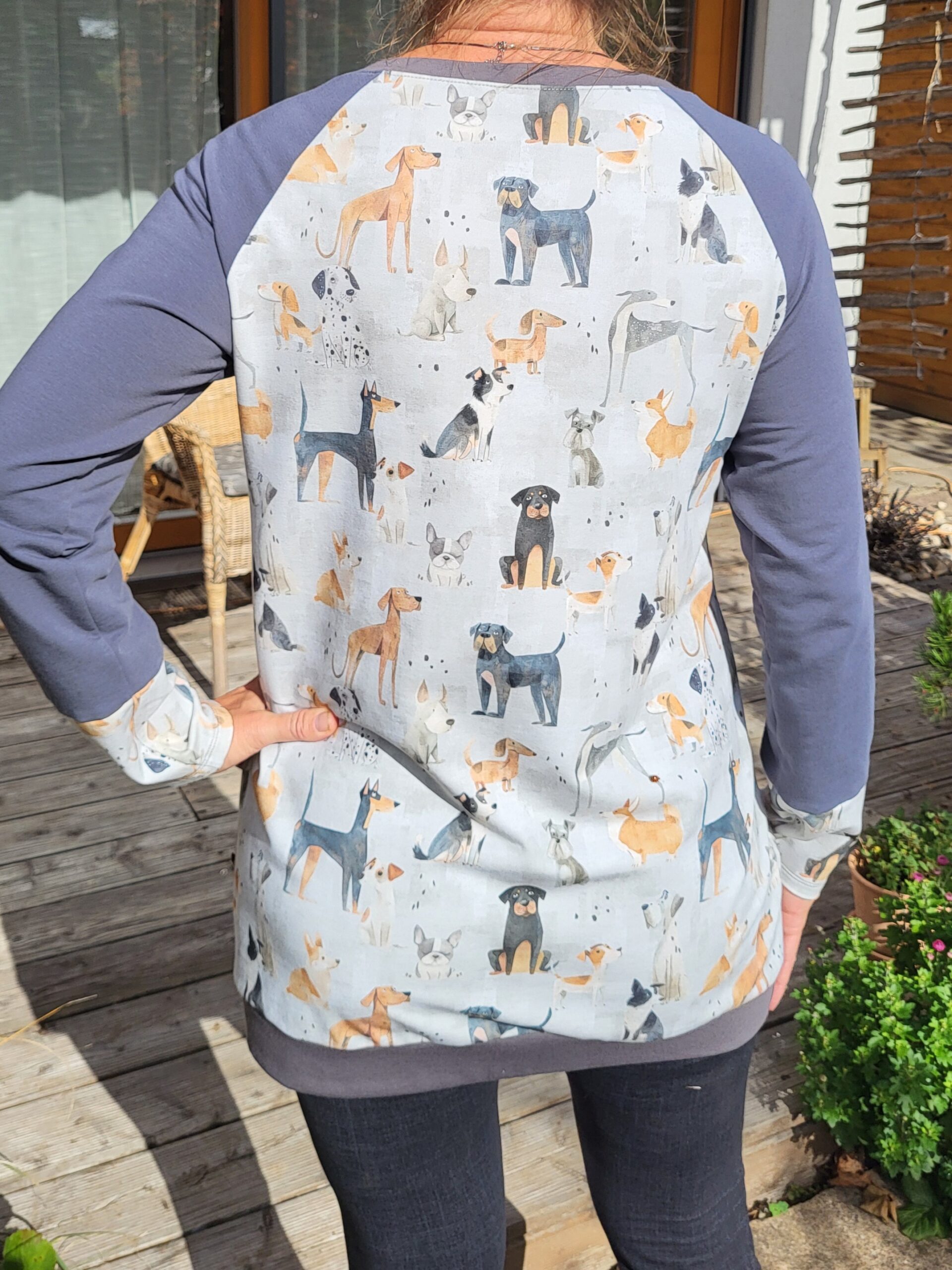 Volná delší mikina s šedými raglánovými rukávy a potiskem pejsků na světle šedém podkladu. Jednoduchý kulatý průkrčník.