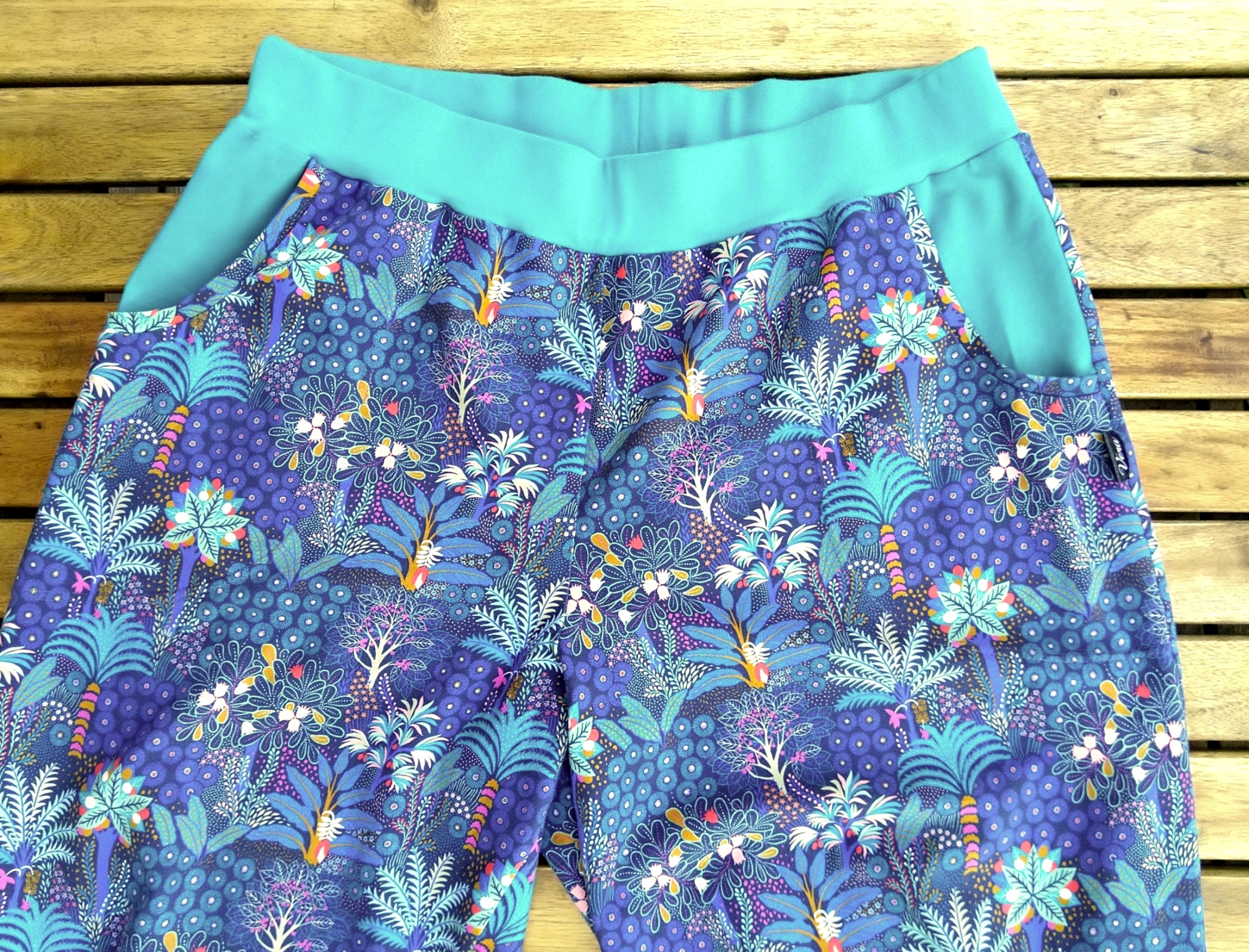 Volné delší capri kalhoty z jemného úpletu s velkými kapsami. Náplet s gumou v pase, úzké spodní lemy.