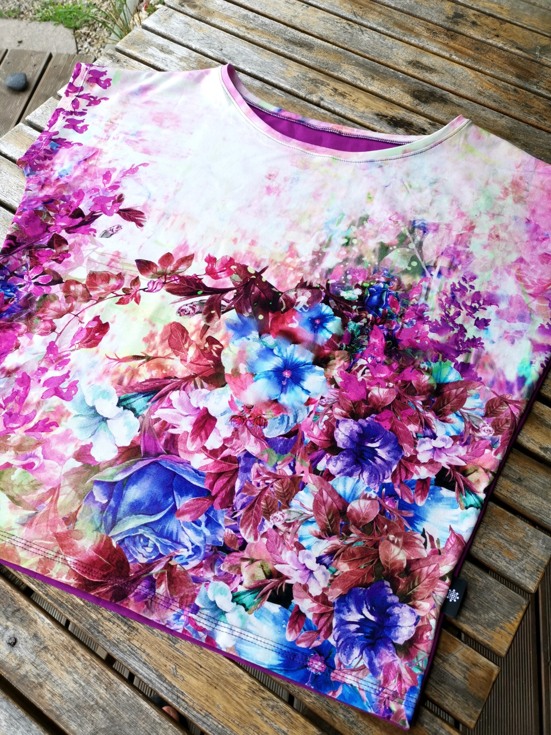 Volné tričko lehce netopýřího střihu s výrazným květinovým potiskem. Záda z kvalitního fialového úpletu.