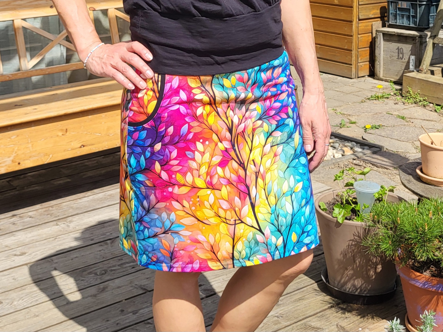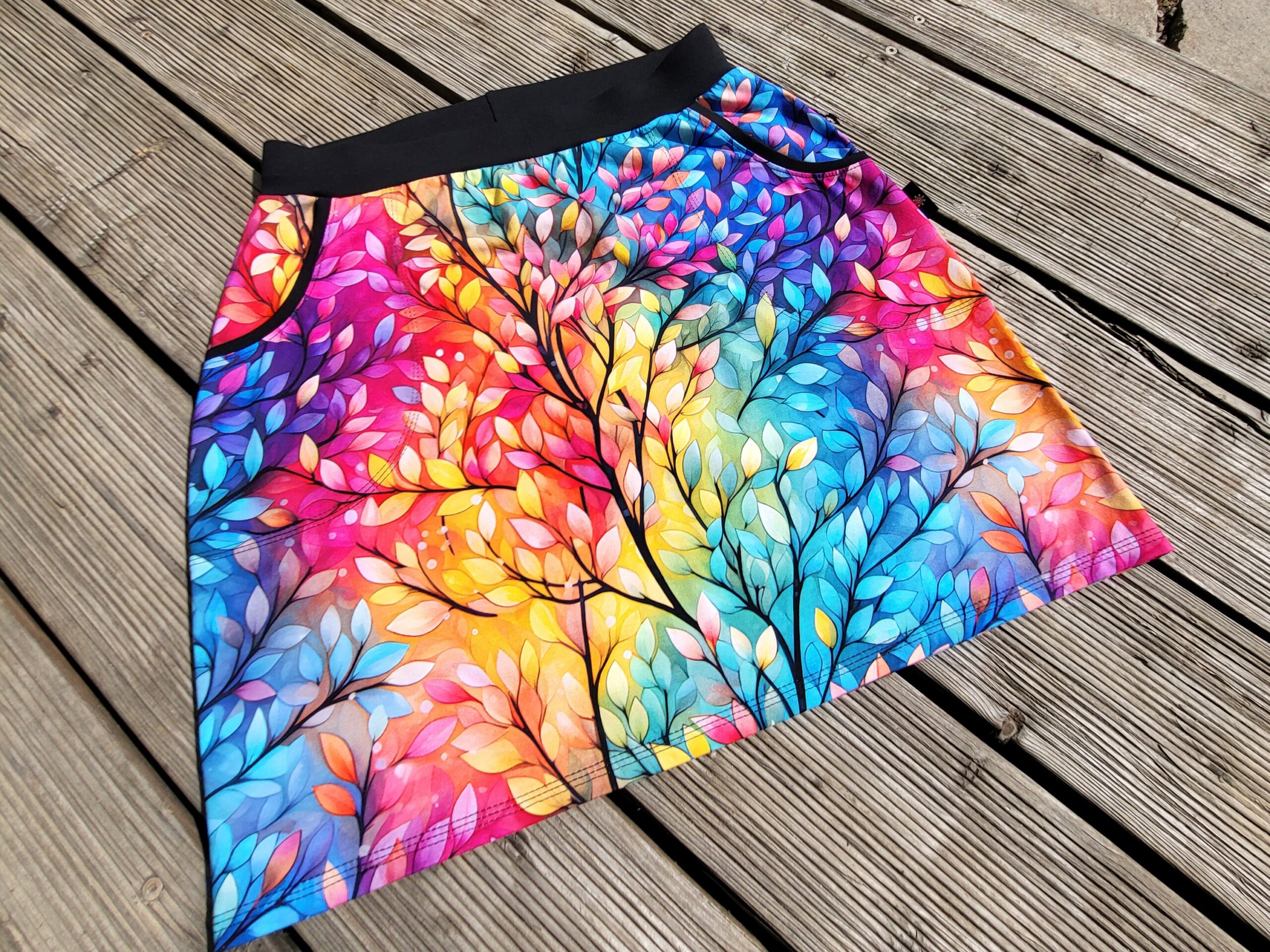Duhově barevná sukně s lístky a velkými kapsami. Pas do černého nápletu s gumou, délka po kolena.