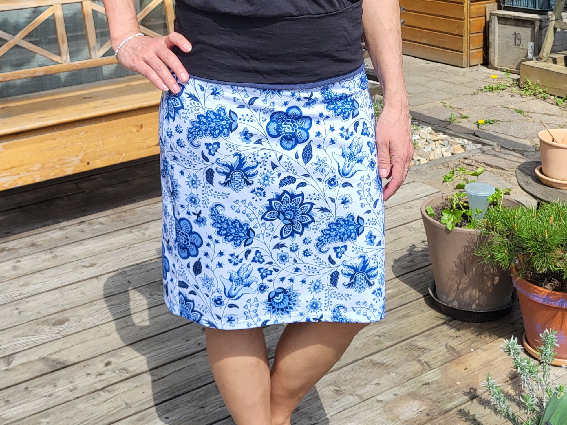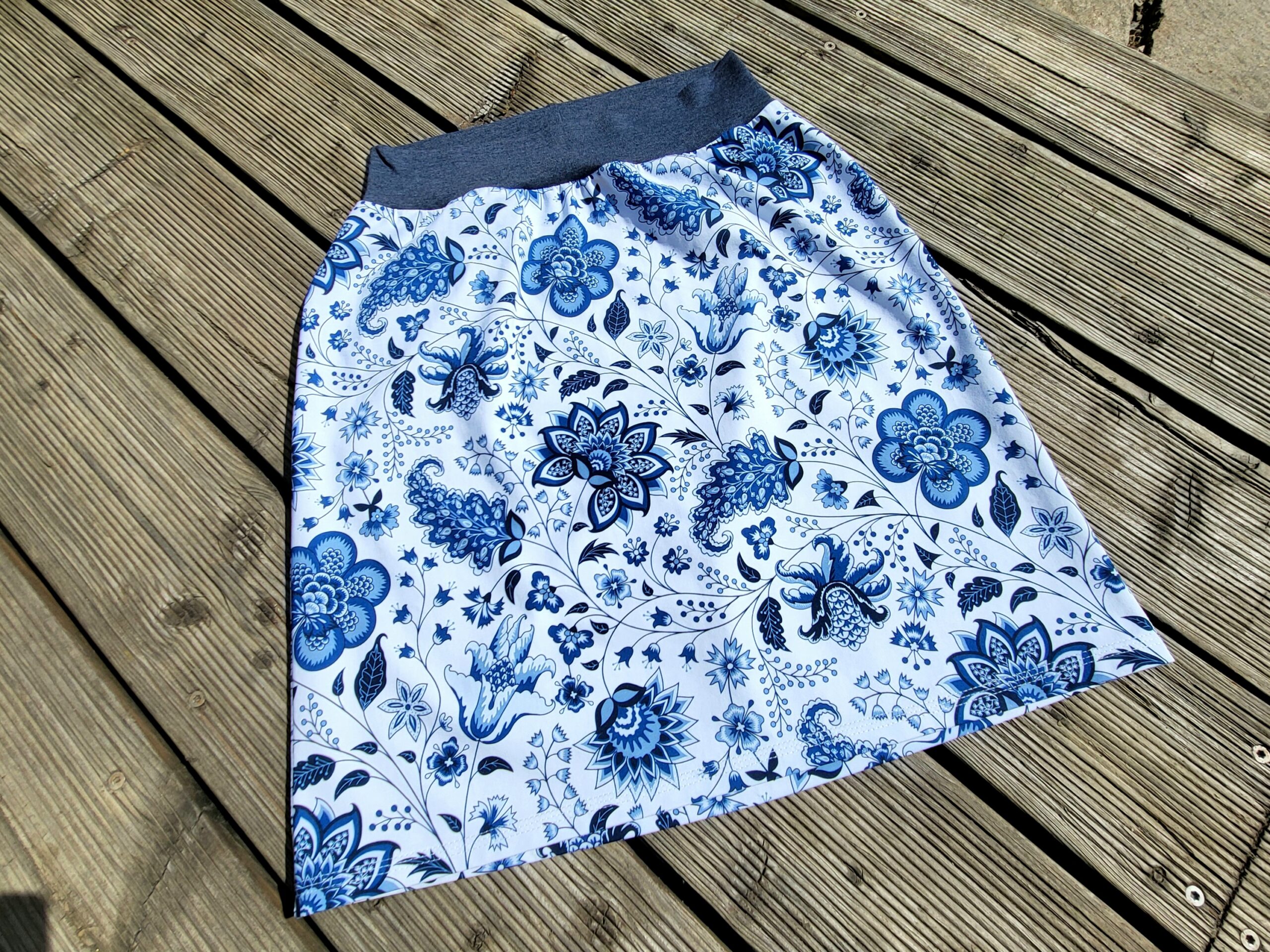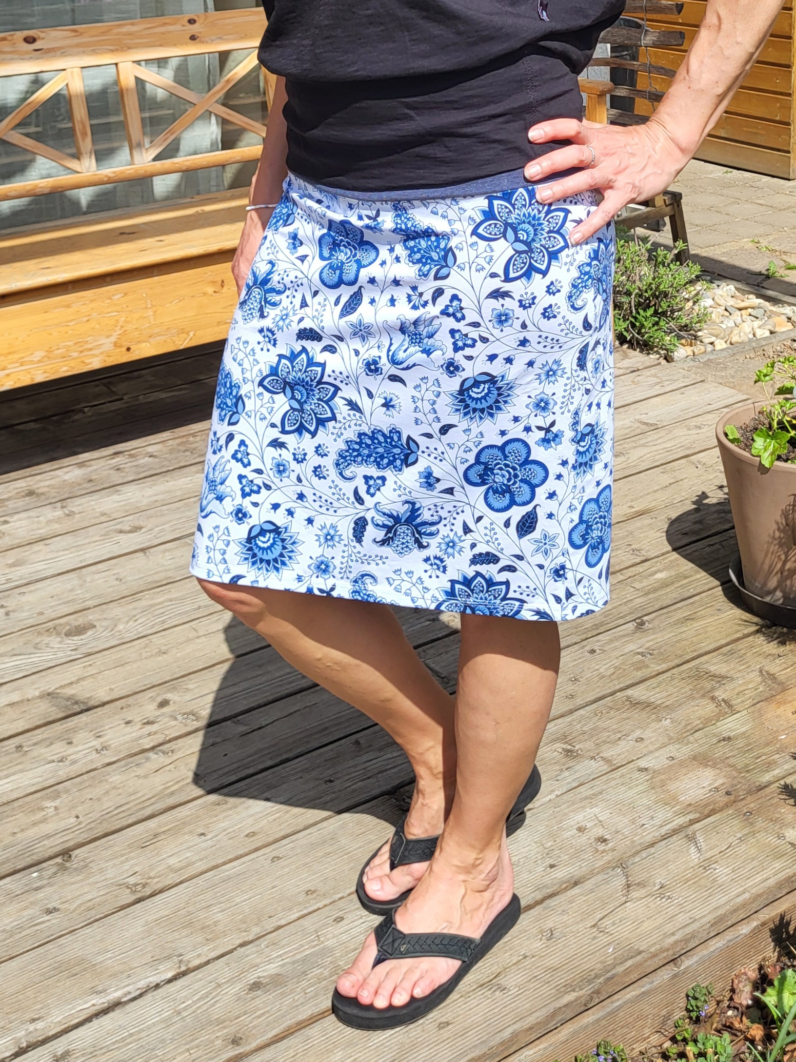 Modrobílá rovná sukně s folklórním vzorem. Pas do modrého nápletu bez gumy, délka pod kolena. Bez kapes.