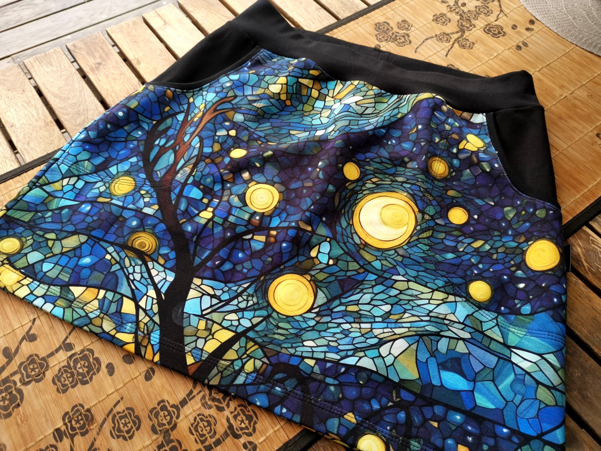 Krátká tmavě modrá sukně s potiskem jako z obrazu. Velké černé kapsy. Pas do černého nápletu s gumou, délka nad kolena.