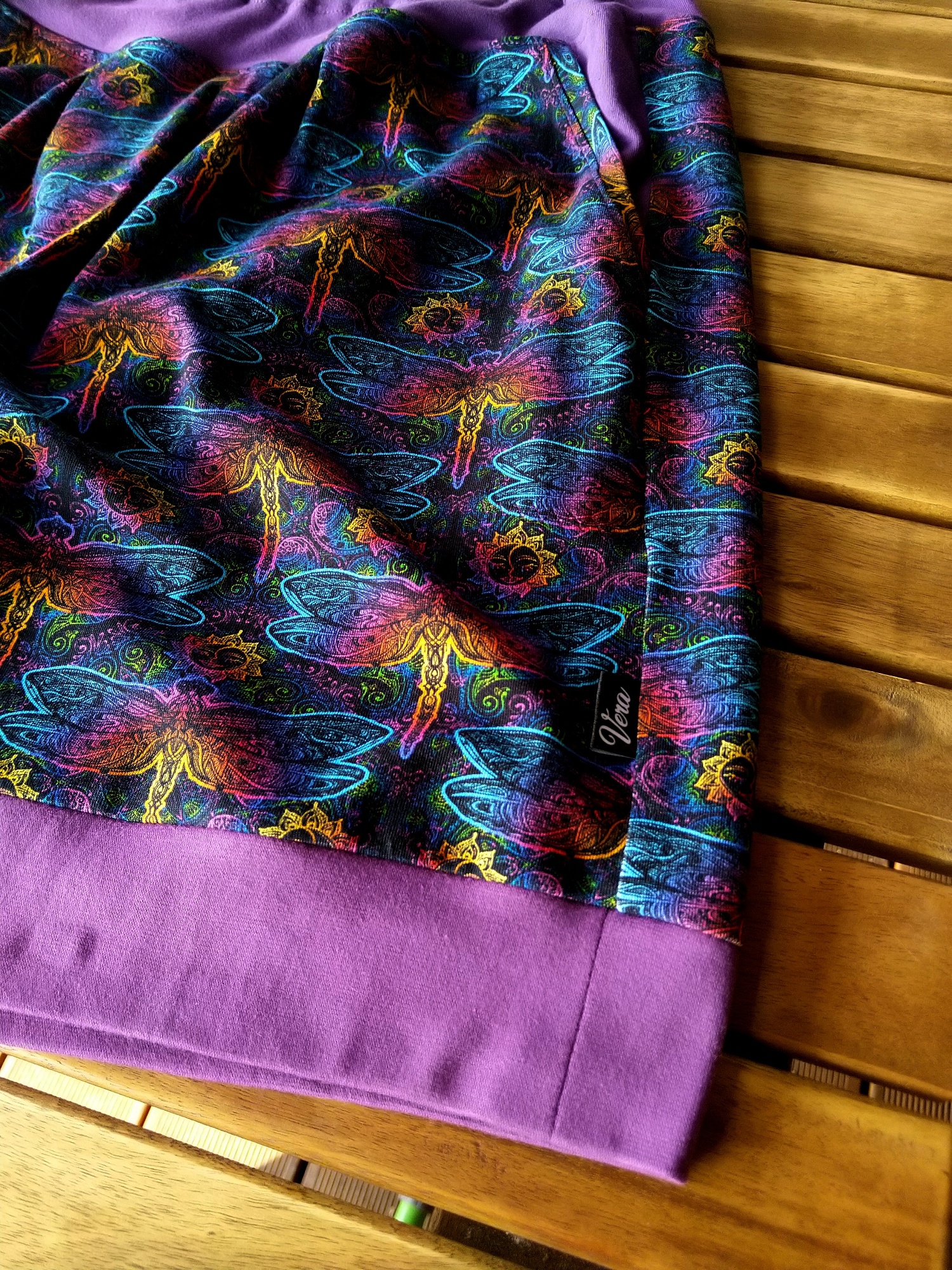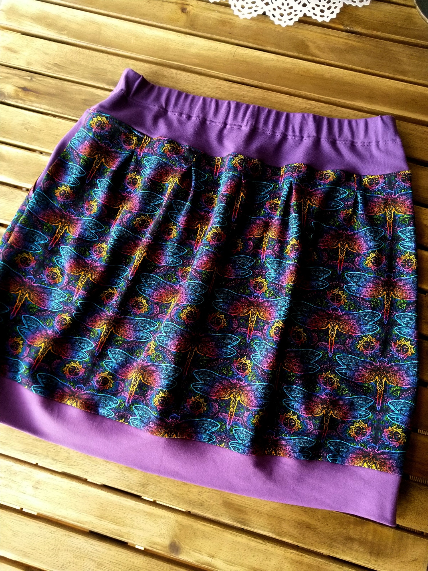 Krásnáá sukýnka z jemného černého úpletu s duhovými vážkami. Fialové náplety a lemování. Velké kapsy a guma v pase. V pase jemné záševky.