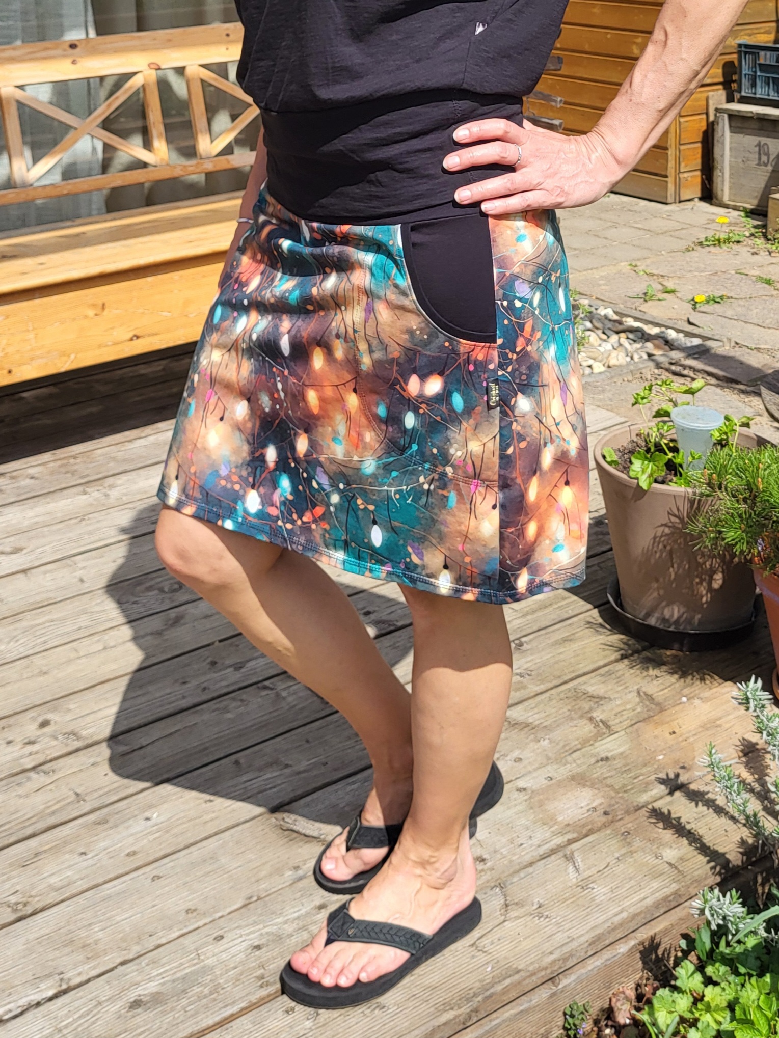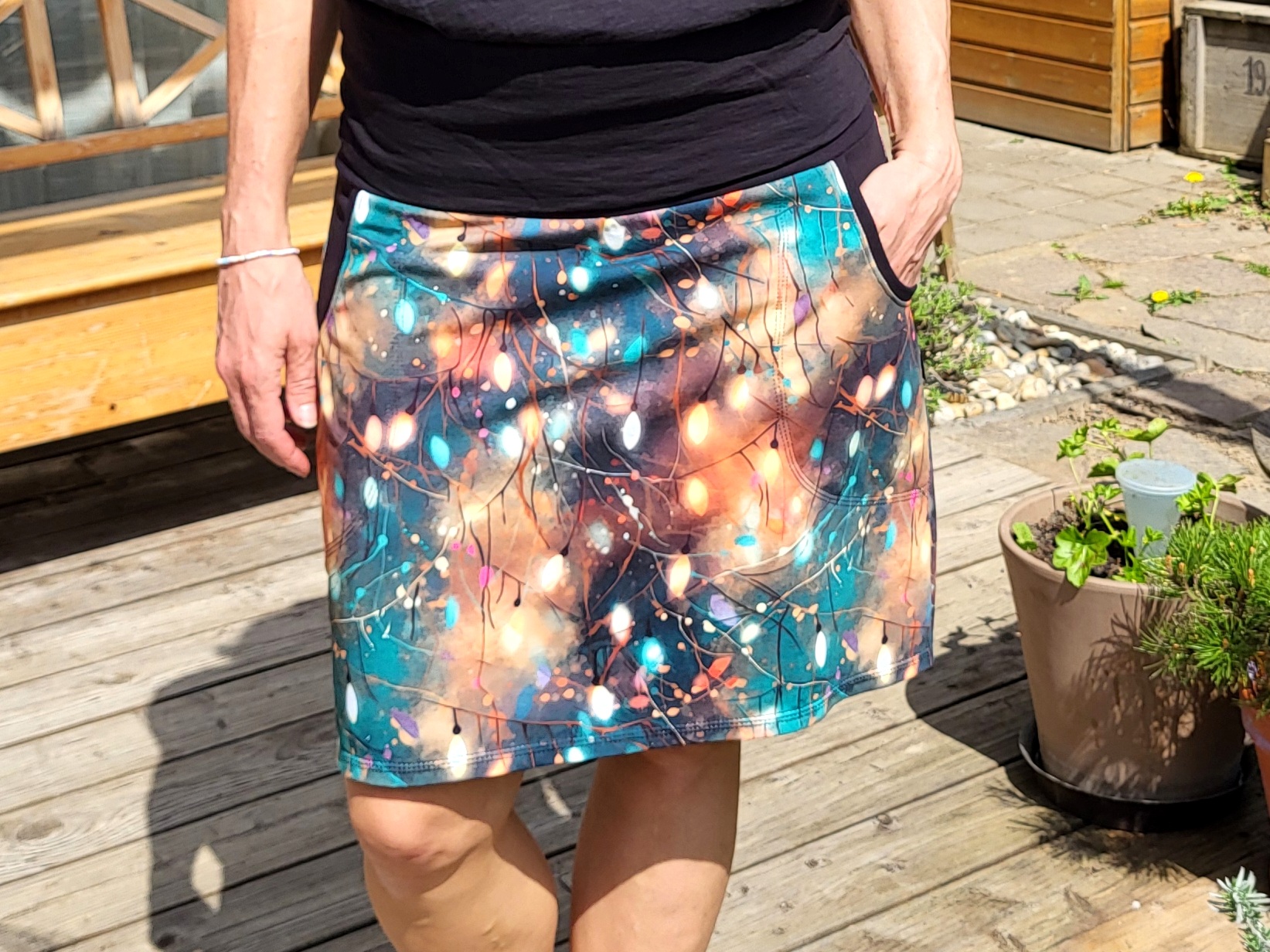 Decentně barevná sukně s velkými kapsami. Pas do černého nápletu s gumou, délka nad kolena.