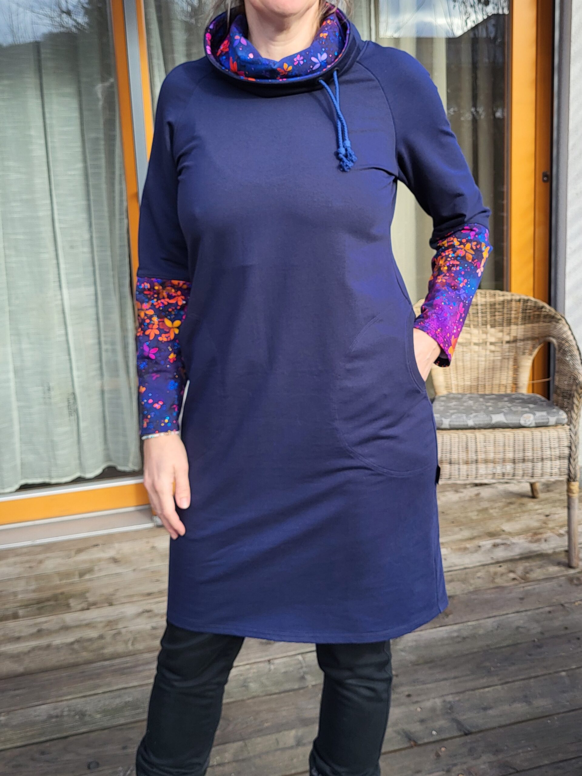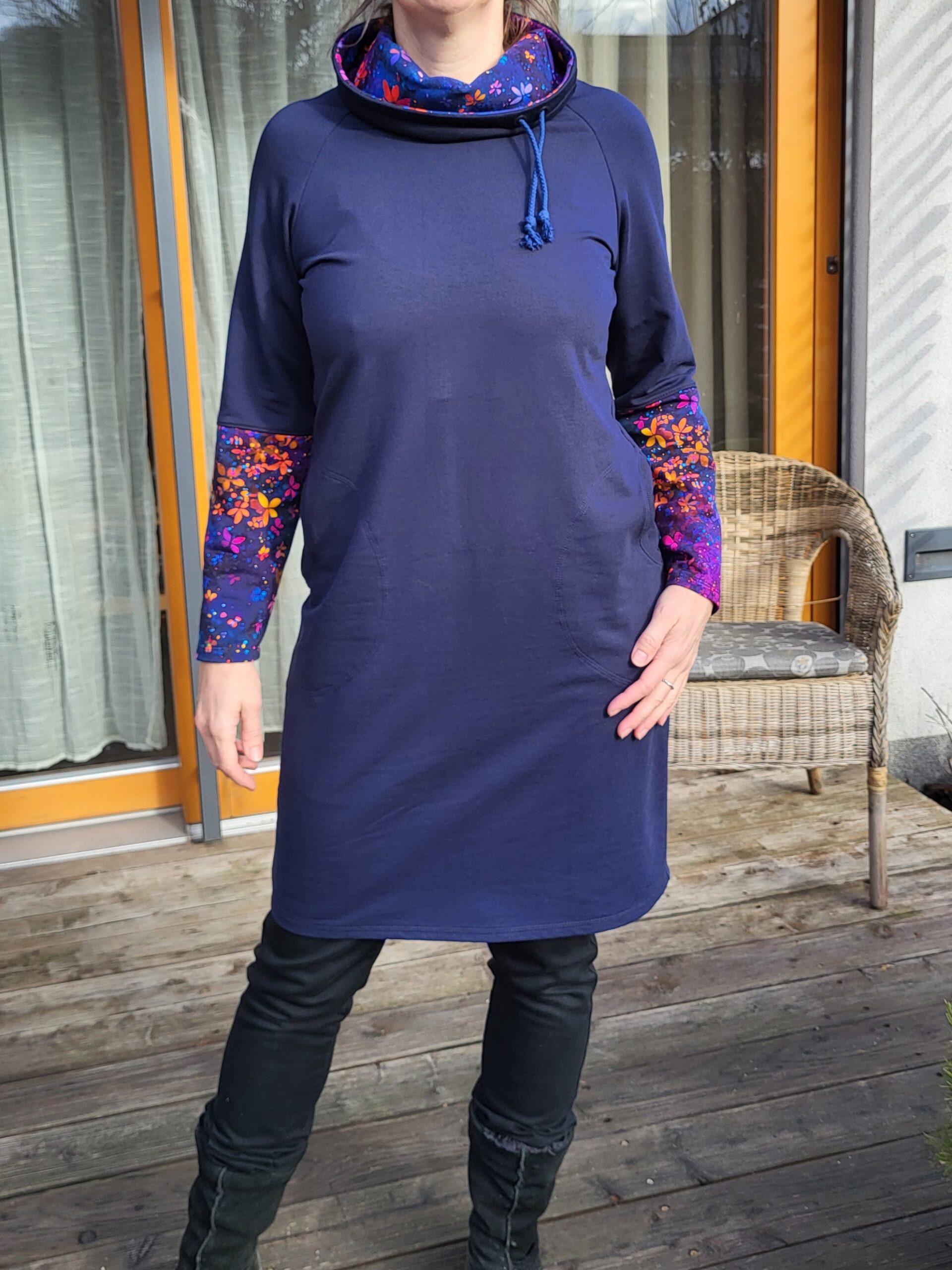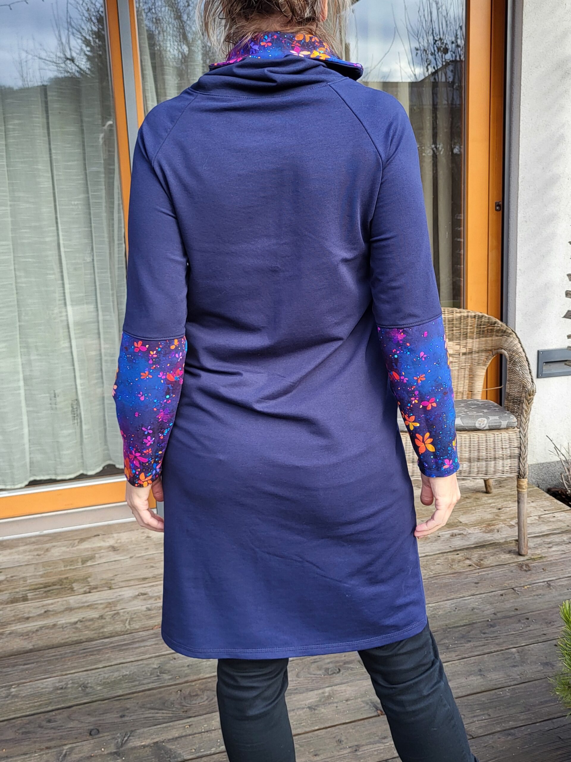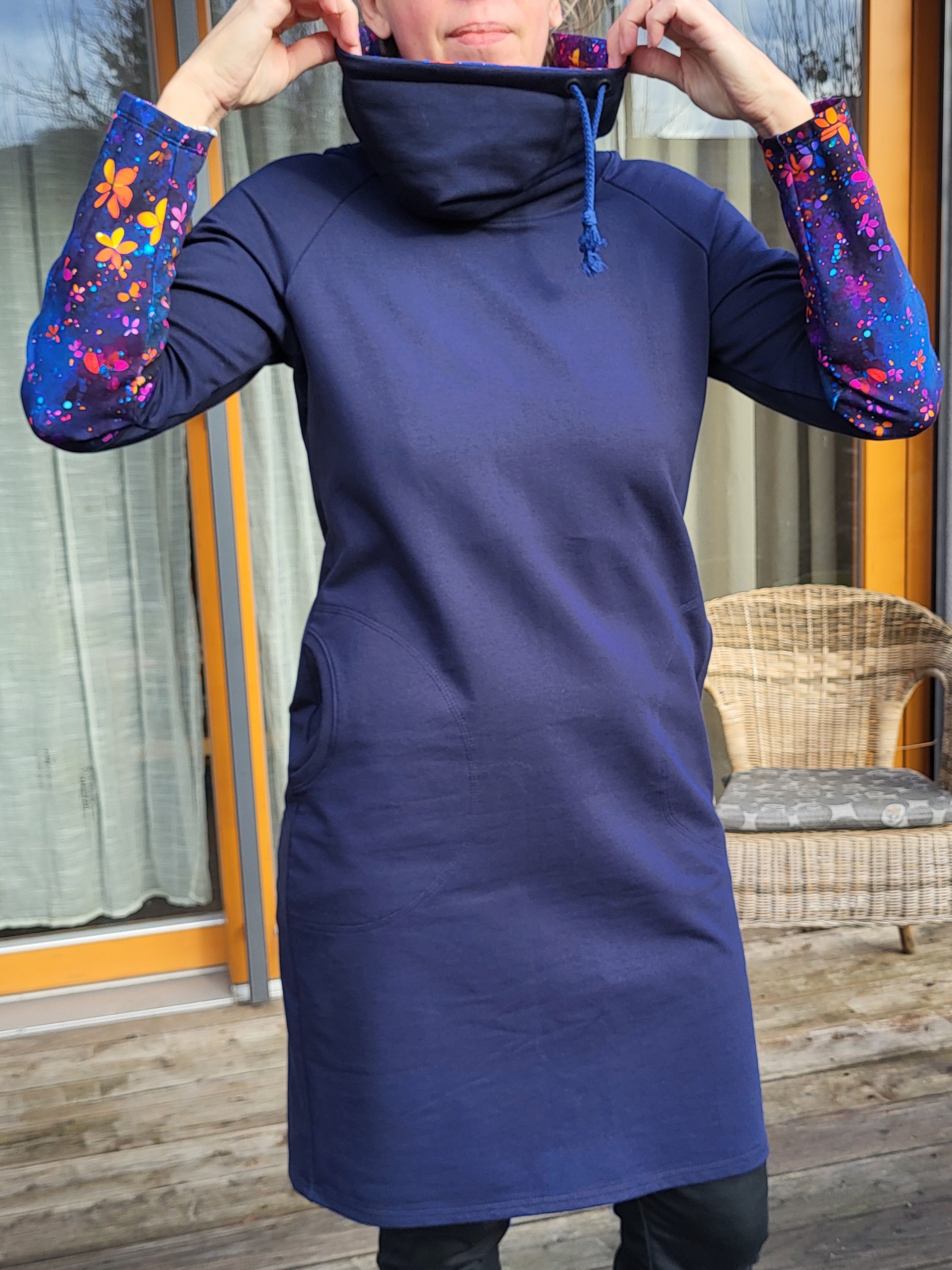 Delší mikinošaty po kolena s velkými kapsami a vyšším límcem se šňůrkou. Jemný vzor na zakončení rukávů a vnitřku límce.