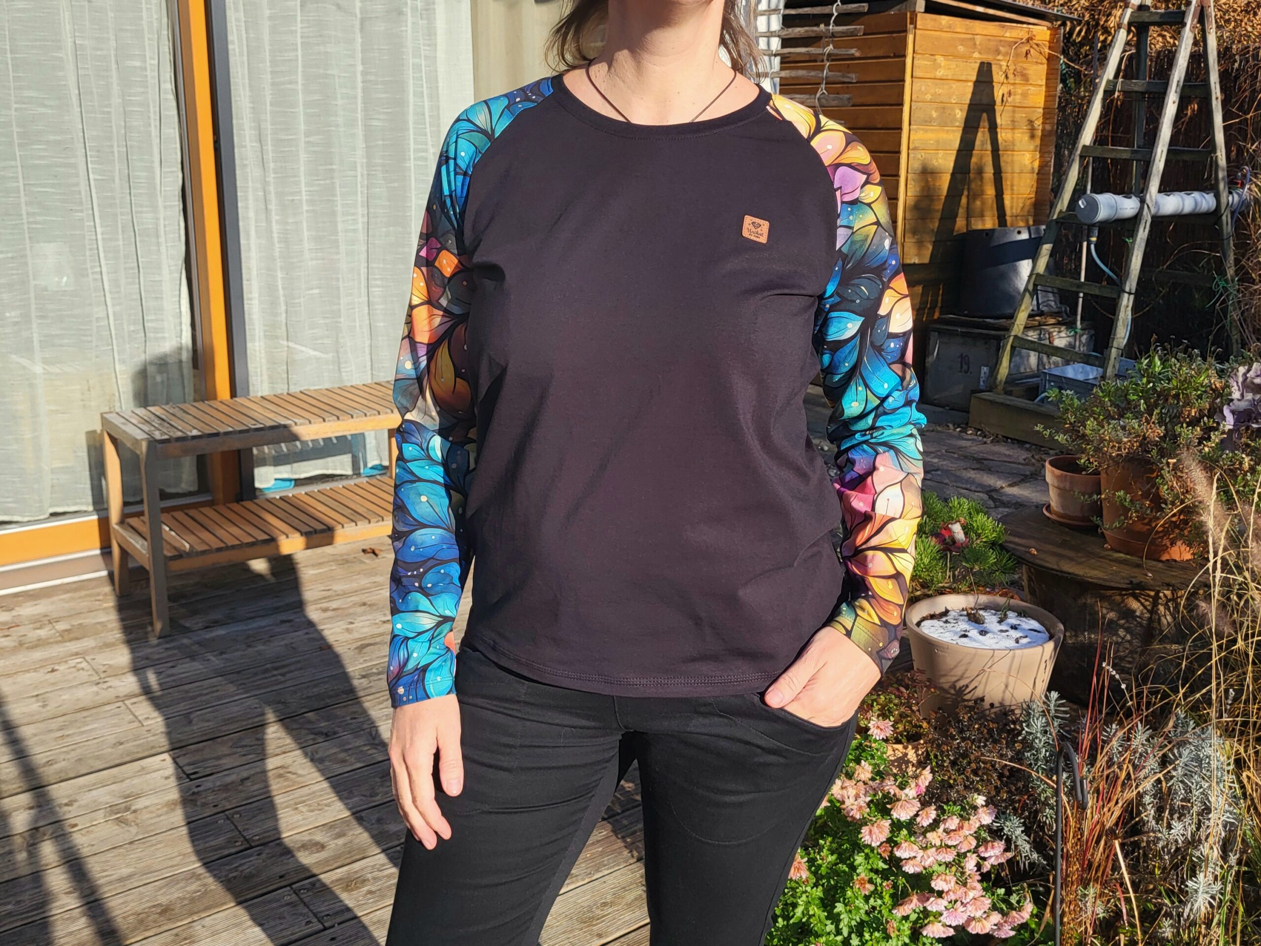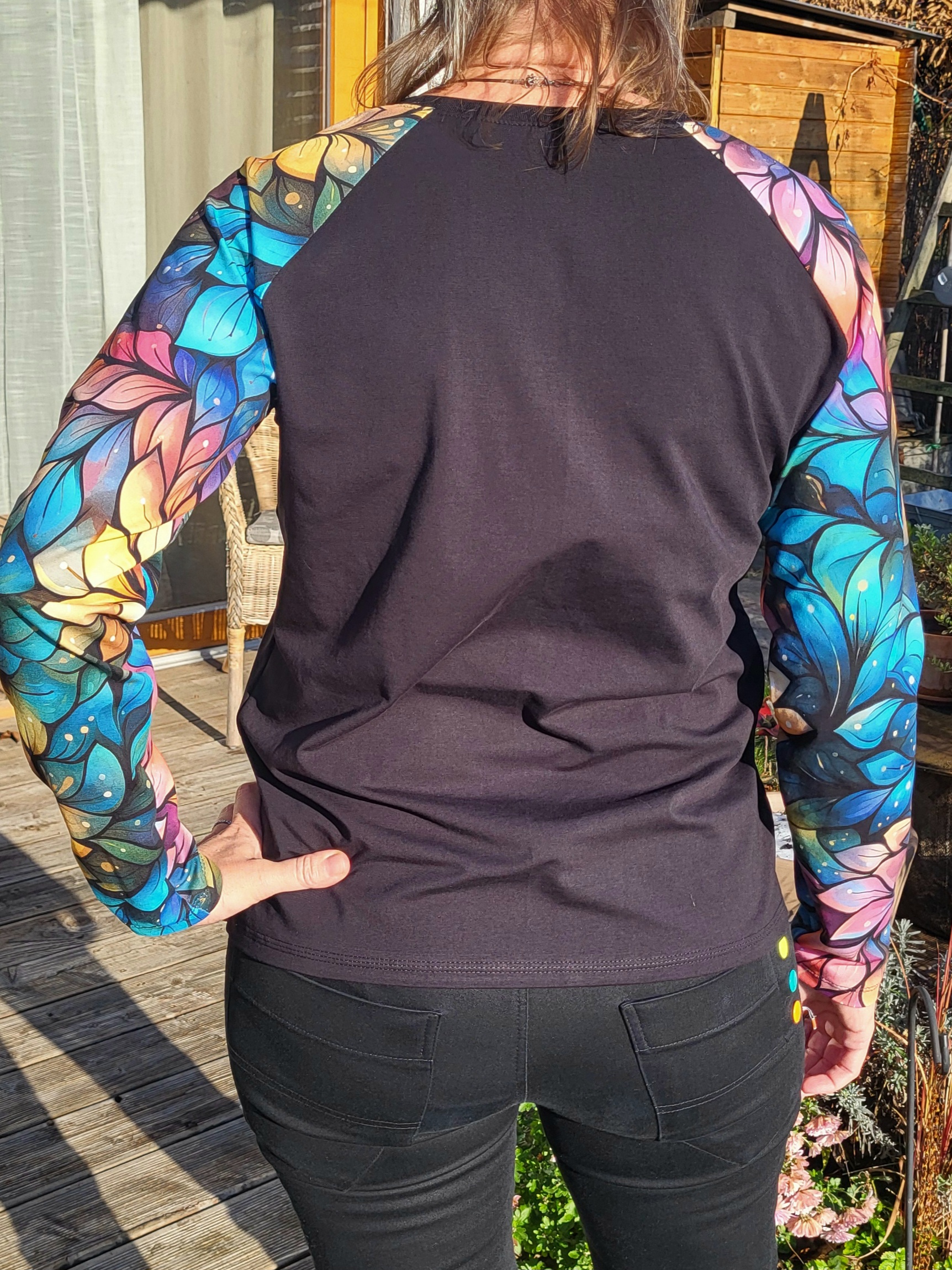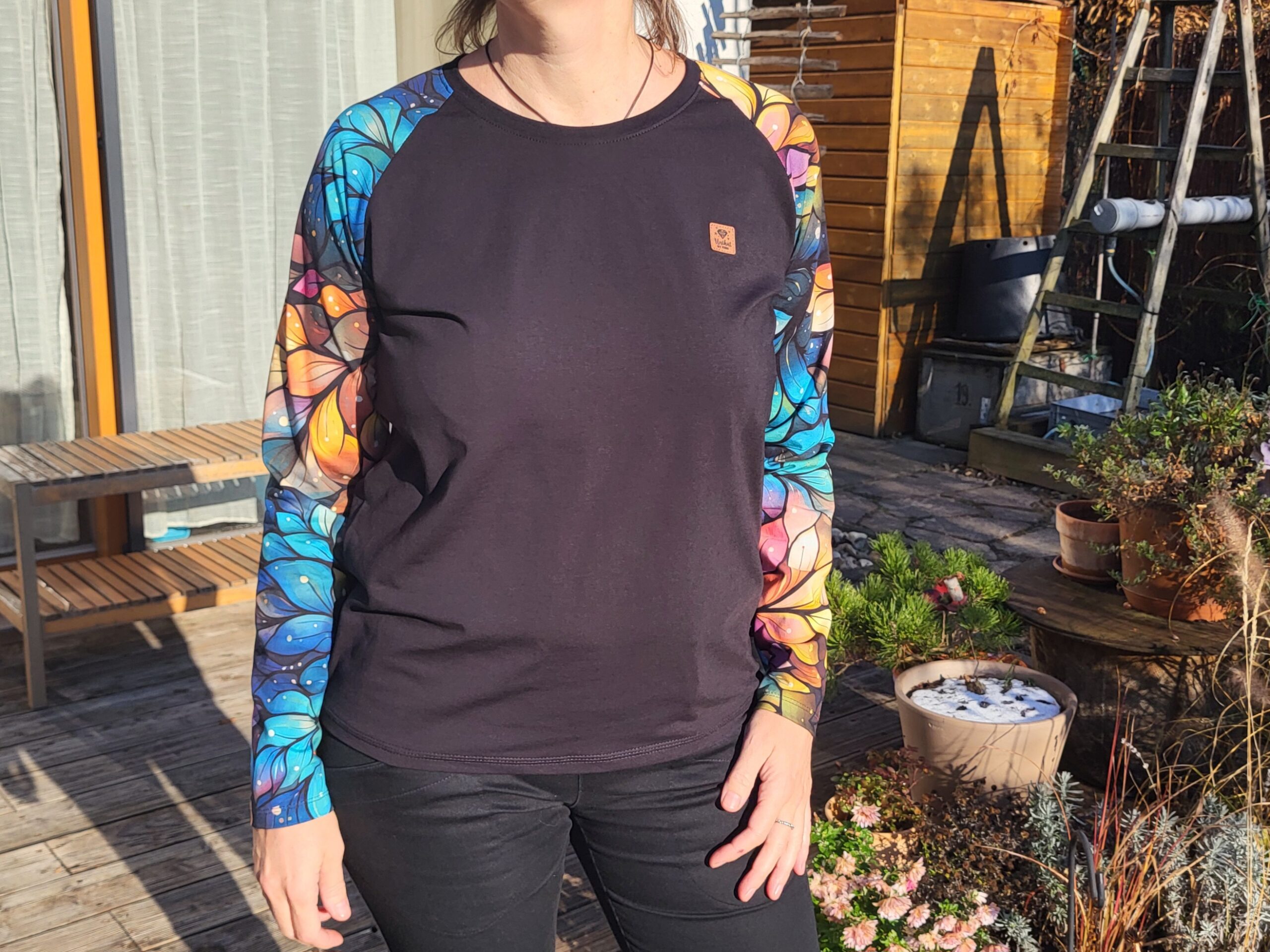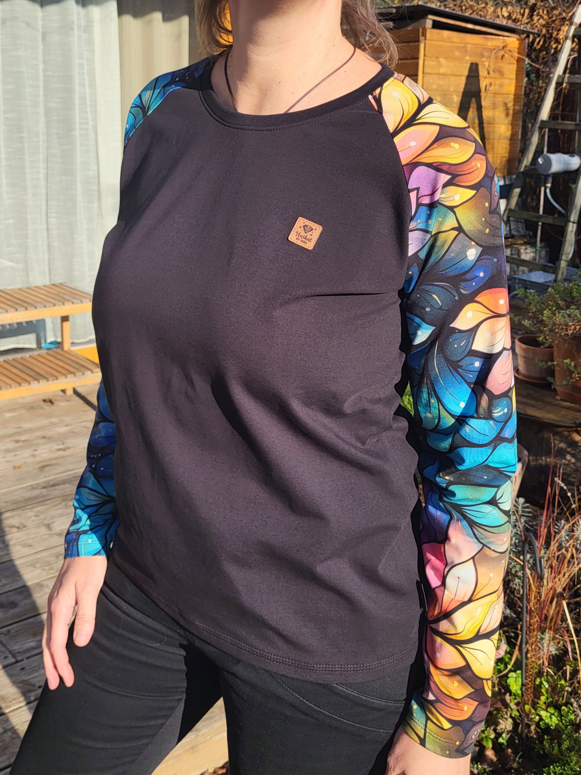 Černé tričko s dlouhými krásně barevnými rukávy. Ozdobeno malým koženkovým štítkem.