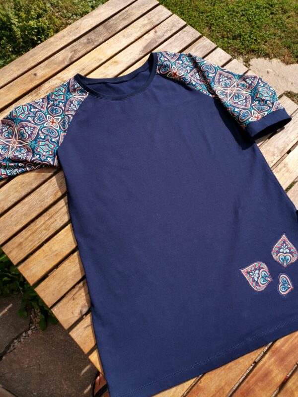 Tmavě modré triko s etno vzorem na 3/4 rukávech. Drobné našité aplikace ve spodní části, na rukávech malé rozparky.