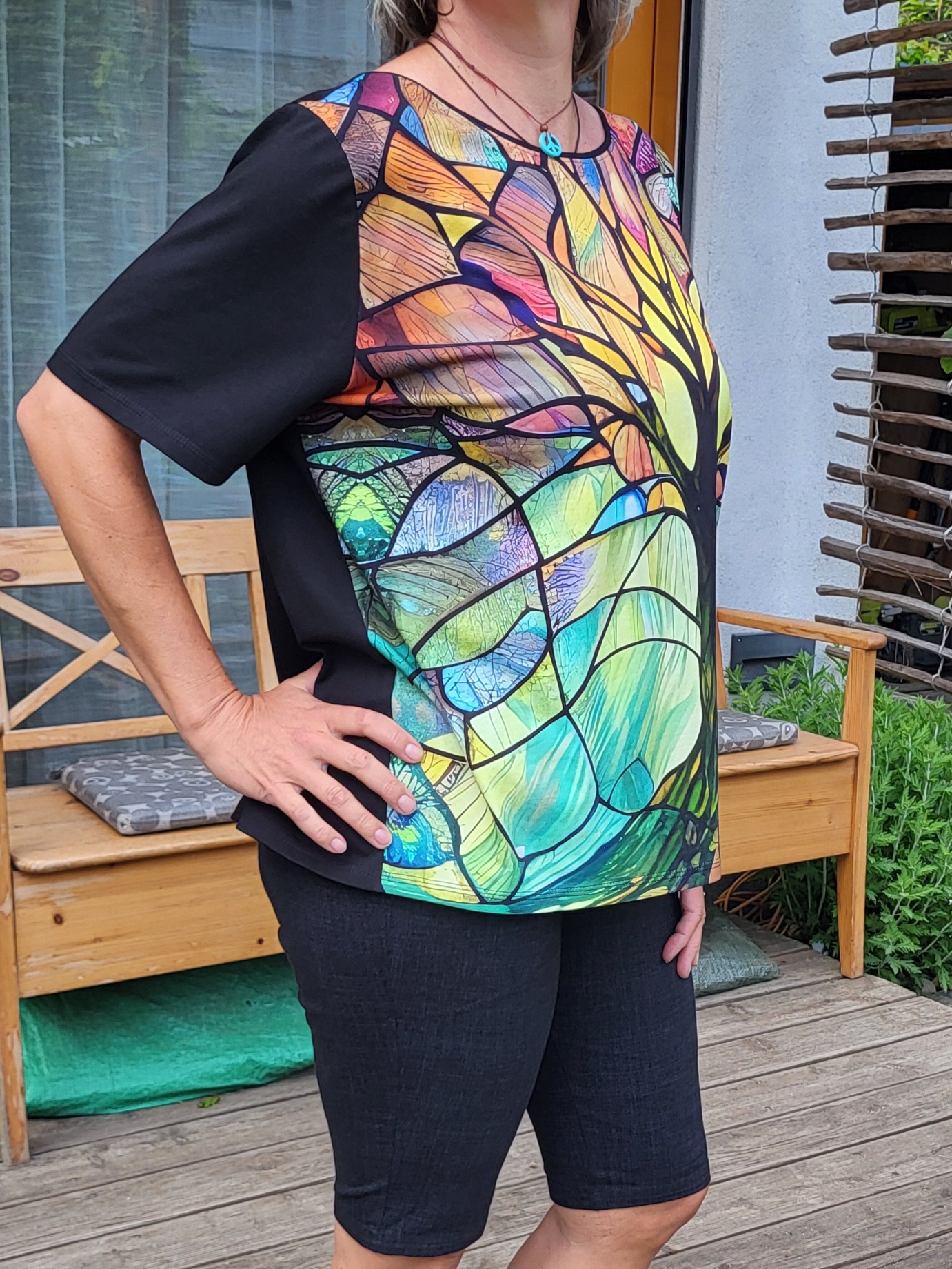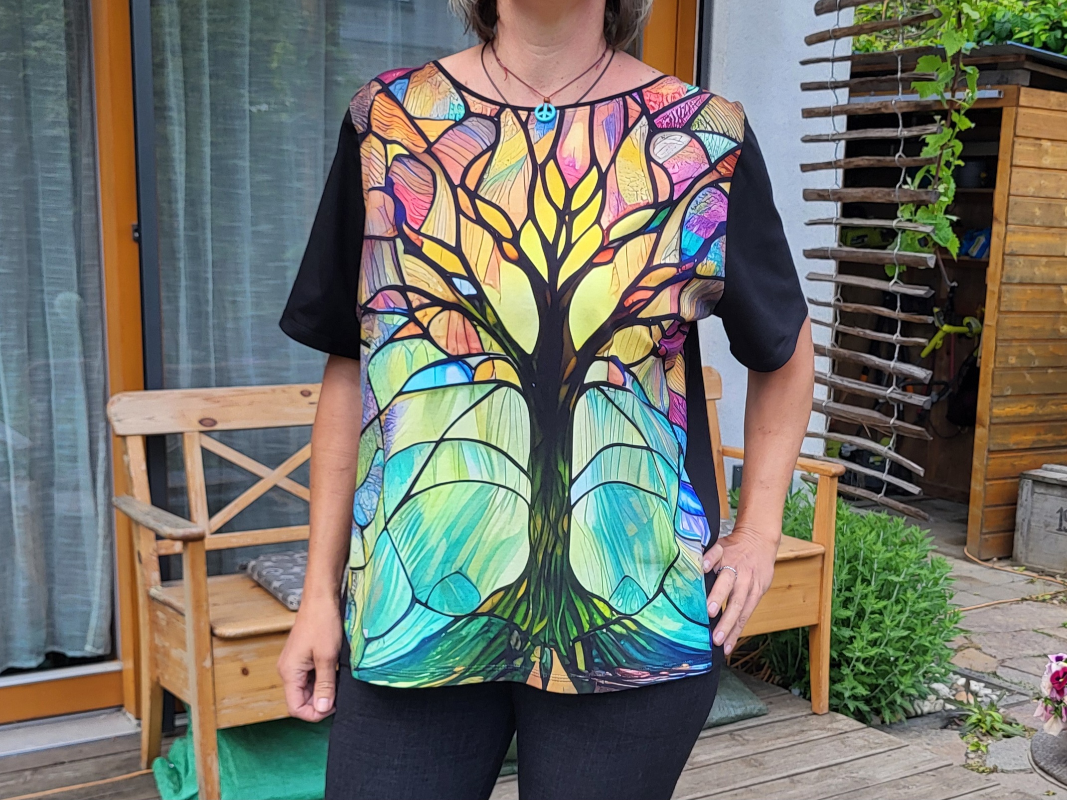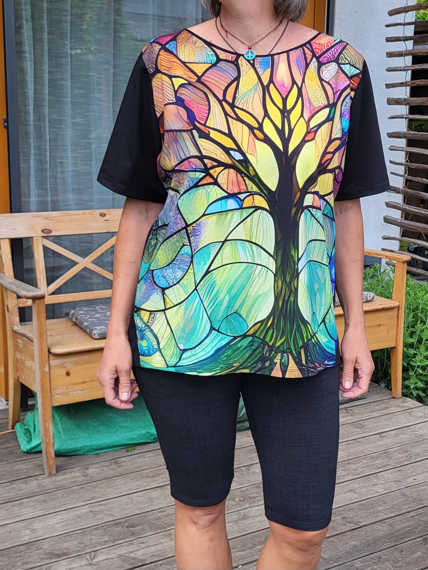Volné tričko s krásným stromem na předním díle. Černé rukávy a zadní díl.
