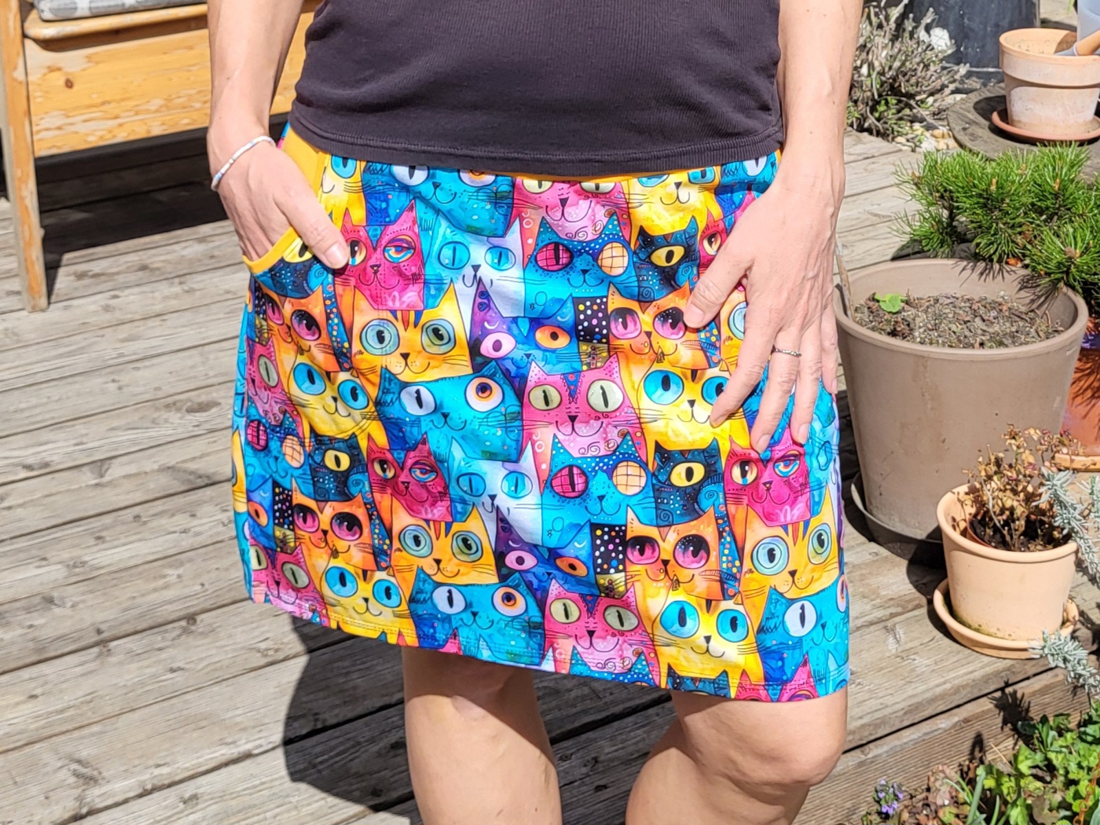 Veselá sukně s barevnými kočkami a velkými zlatými kapsami. Pas do hořčicového nápletu s gumou, délka nad kolena.